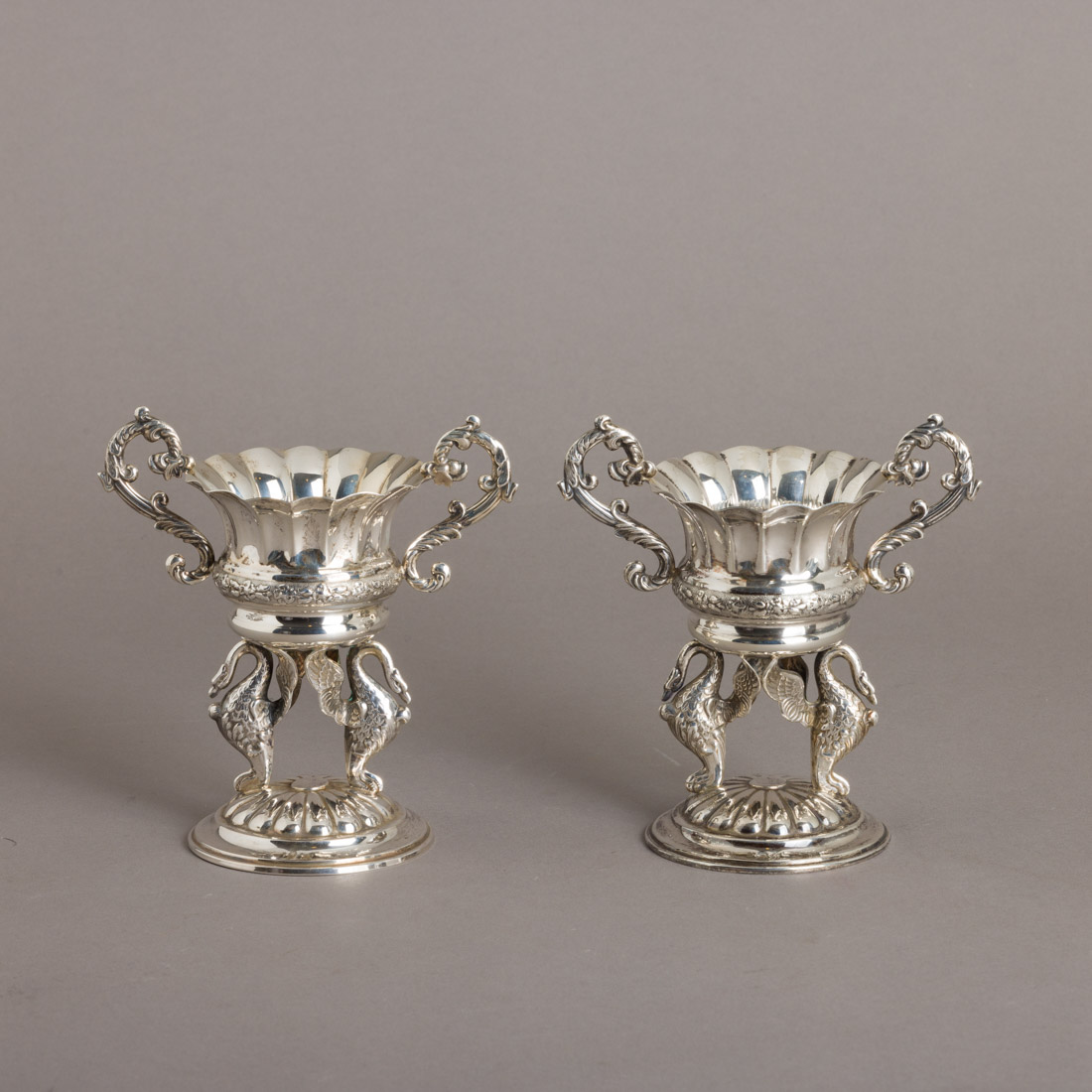Em prata espanhola de 915 marcas de garantia de teor (pós 1934), decoração relevada "cisnes". Sem marcas portuguesas, ao abrigo do Decreto-Lei n.º 120/2017. Sinais de uso.