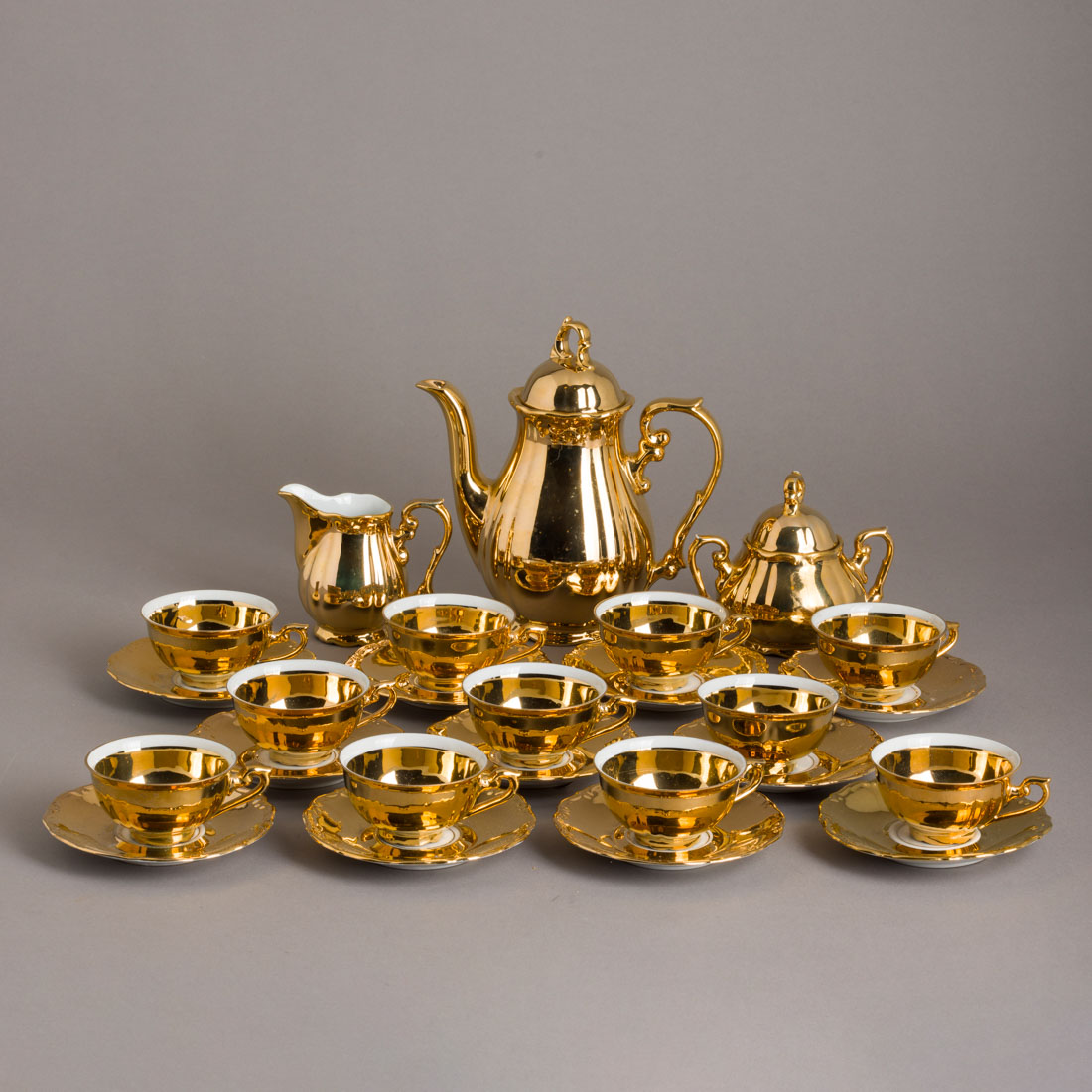 Em porcelana moldada, decoração a dourado. Alemã, marcada JKW Karisbad. Composto por cafeteira, leiteira, açucareiro e onze chávenas de café com pires. Sinais de uso