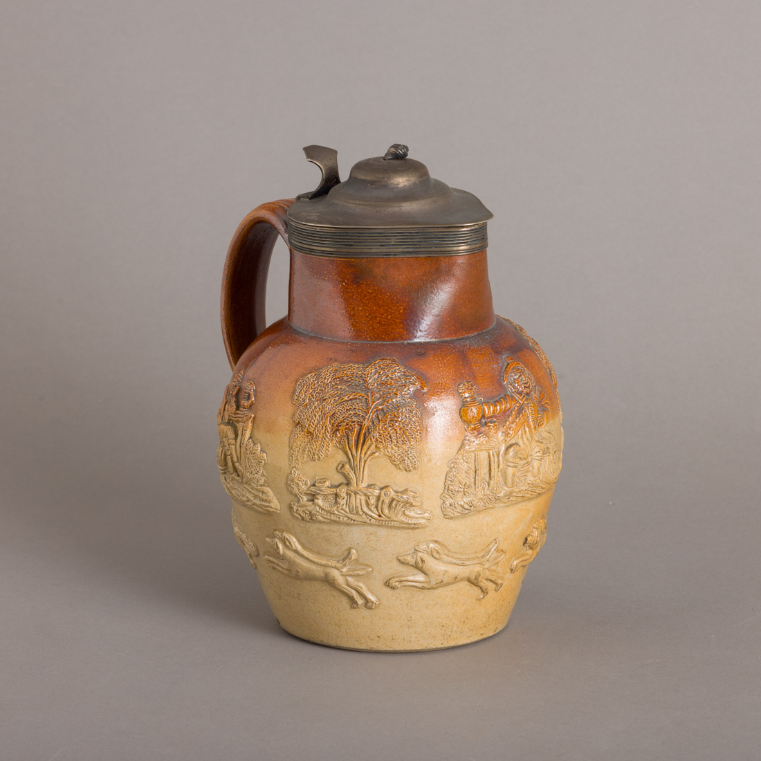 Em grés vidrado, decoração relevada com cenas do quotidiano, tampa em metal branco. Possivelmente inglês. Sinais de uso, leve esbeiçadela.