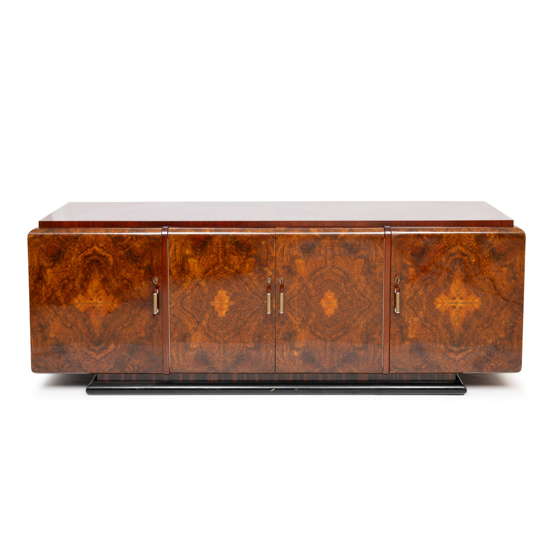 Em nogueira, folheado a nogueira e raiz de nogueira, de quatro portas, ferragens em metal prateado e baquelite. Pequenas falhas e pequenos defeitos.