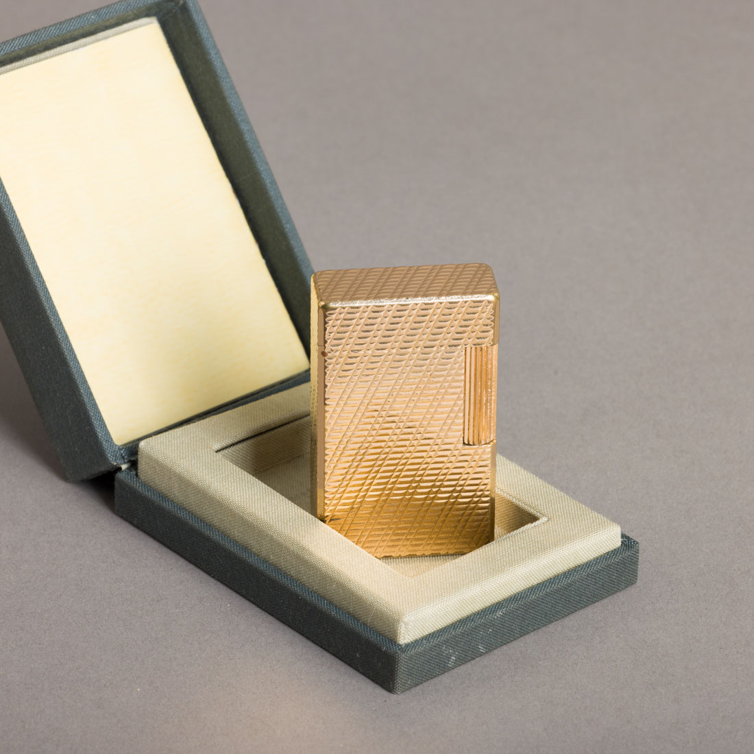 Em metal dourado, decorado com gravados, marcado S.T.Dupont. Com estojo, caixa e documentos originais. Sinais de uso e leve desgaste.