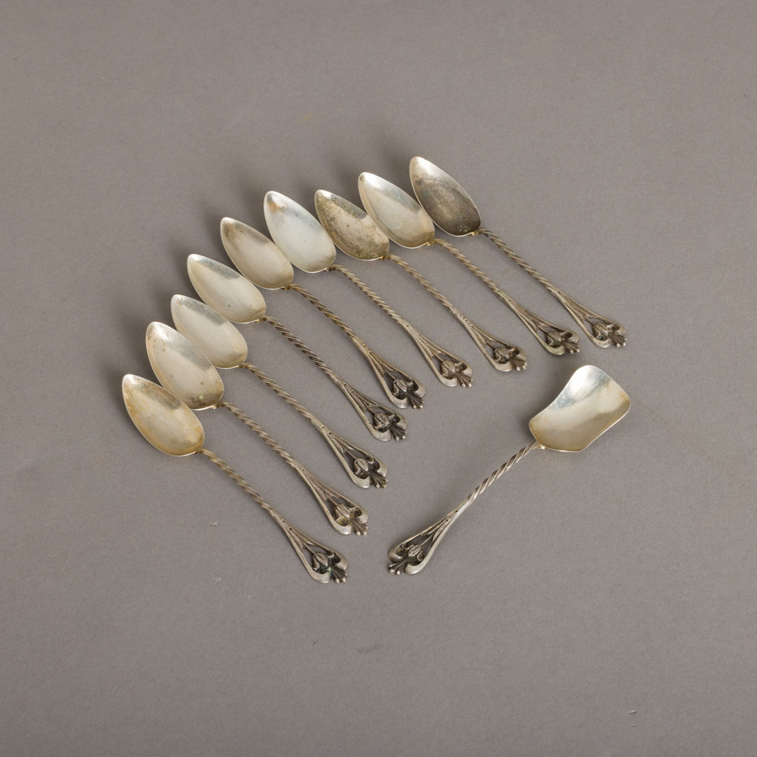 502. CONJUNTO DE NOVE COLHERES DE CAFÉ E CONCHA DE AÇÚCAR