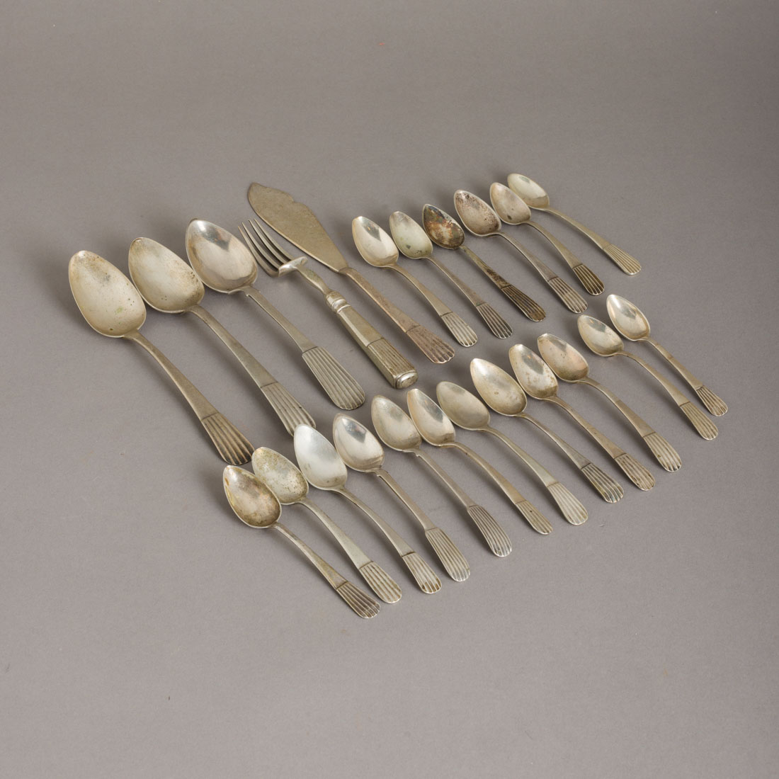 Em prata portuguesa do Séc. XIX/XX com diferentes marcas de ensaiadores e ourives, decoração "caninhas". Com 3 colheres de sopa, 14 de chá e 4 de café. Sinais de uso, pequenas amolgadelas