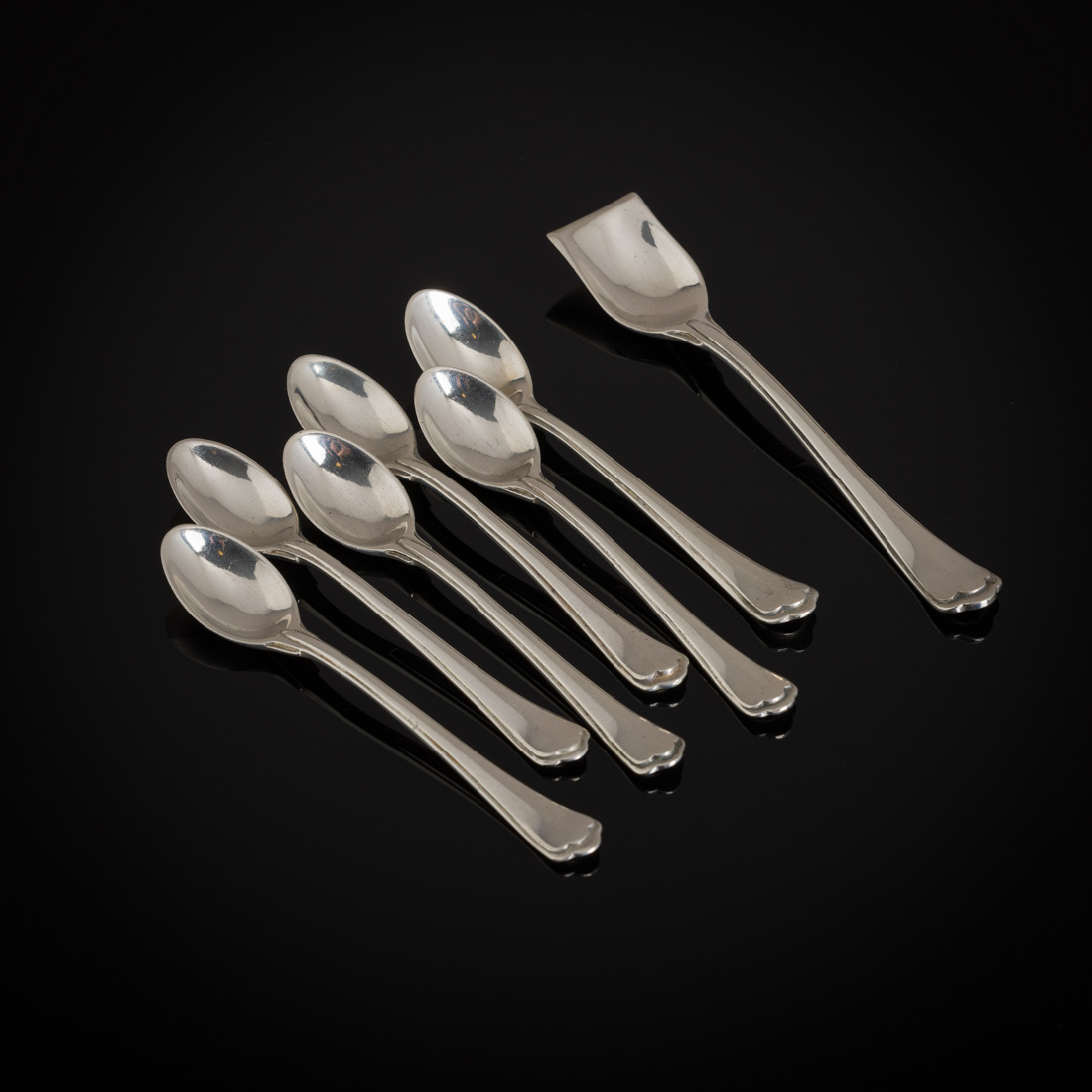 512. CONJUNTO DE SEIS COLHERES DE CAFÉ E CONCHA DE AÇÚCAR