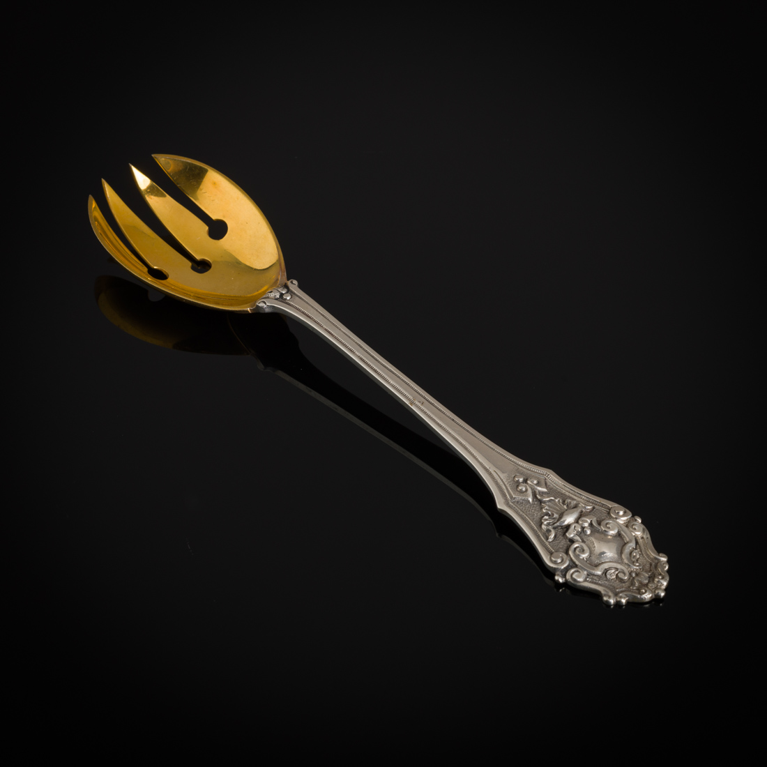 Em prata portuguesa contraste águia (1938-1984) de 833, decoração relevada parcialmente dourada. Sinais de uso.