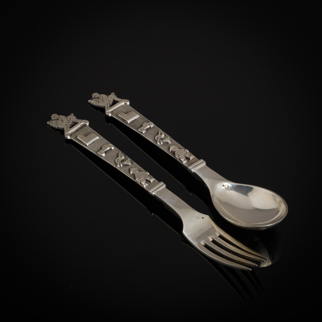 Em prata portuguesa contraste águia (1938-1984) de 833, decoração relevada com motivos infantis. Sinais de uso.