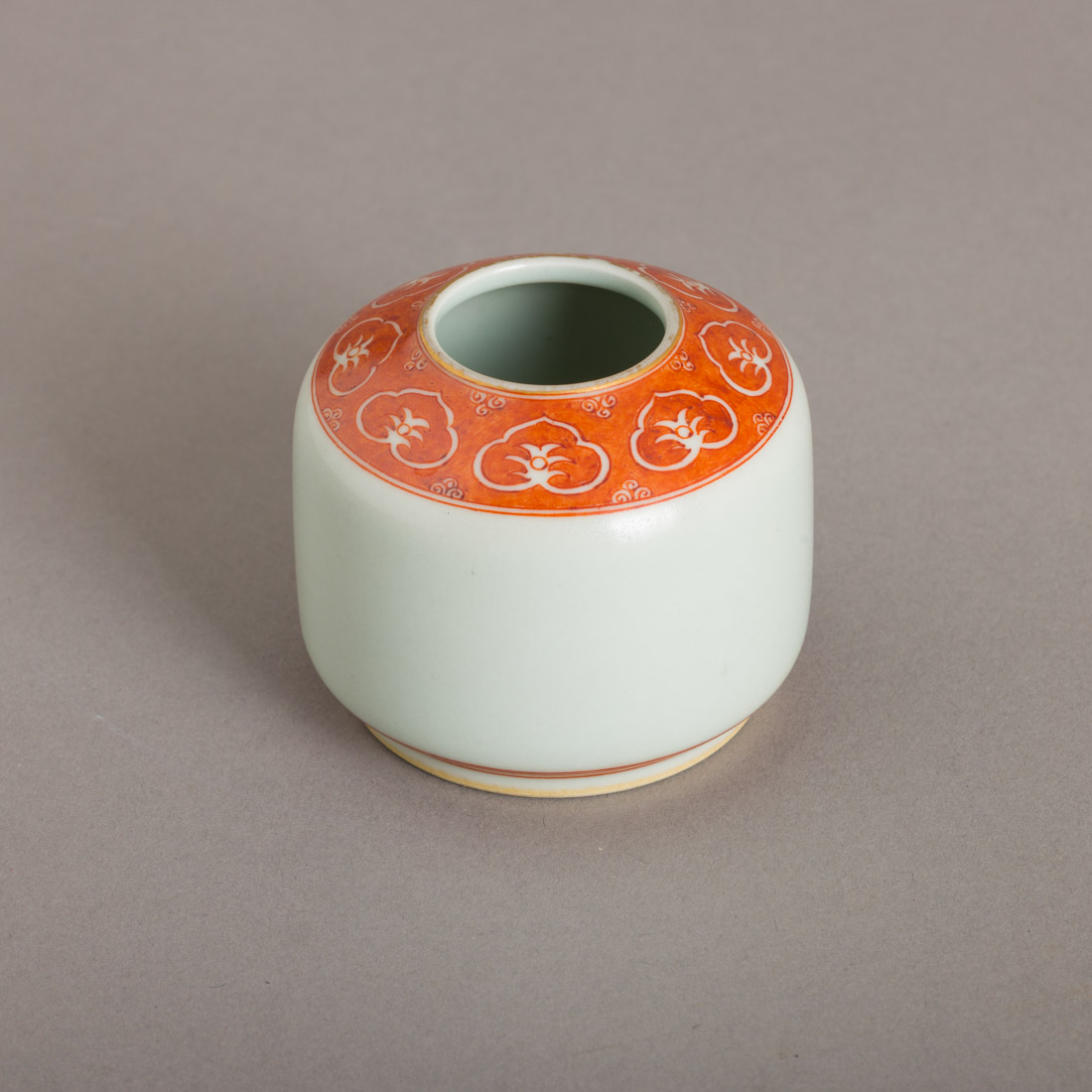 Em porcelana da China, decoração a rouge de fer e a dourado com elementos vegetalistas. Marcada. Sinais de uso e leve desgaste.