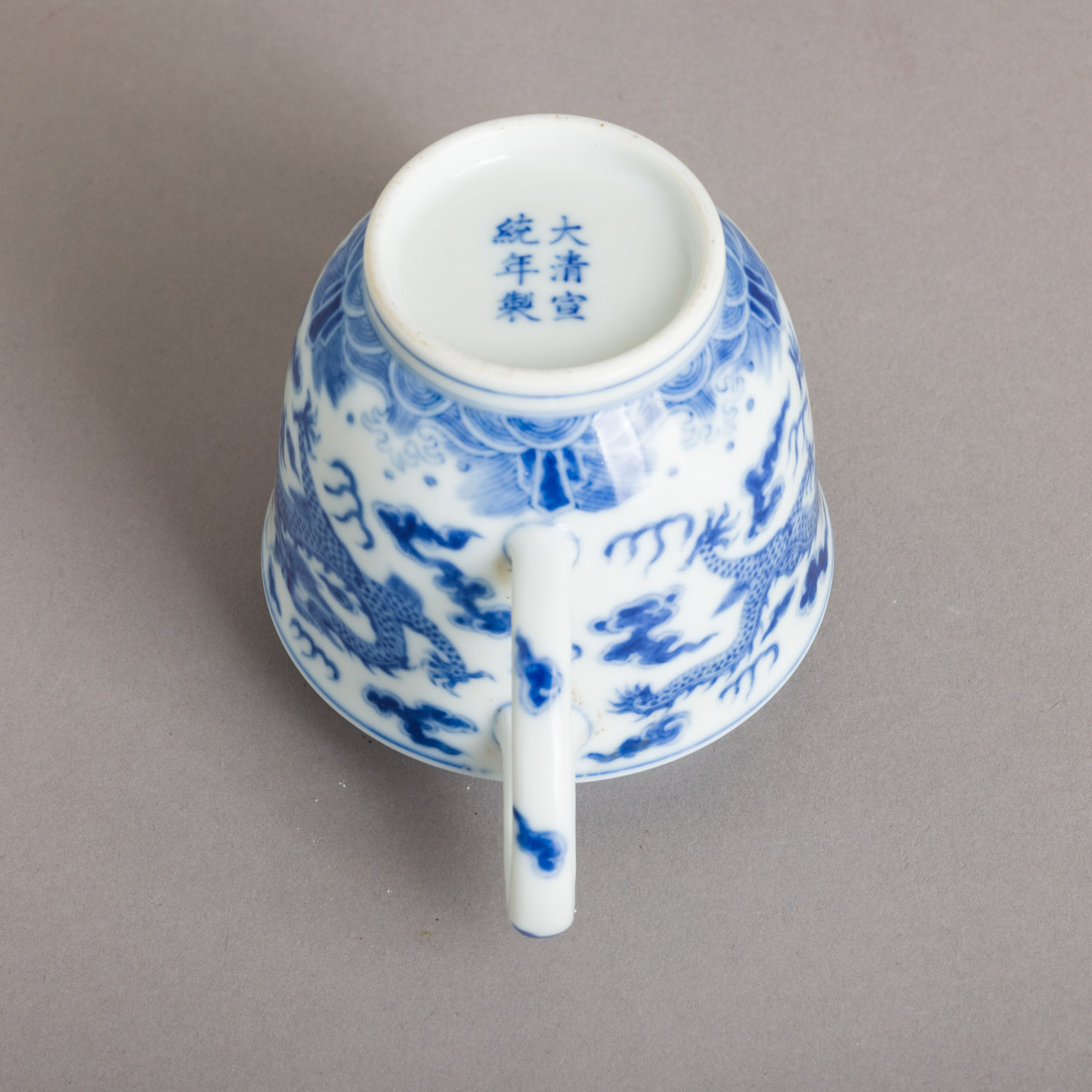 Em porcelana da China, decoração a azul "dragões entre nuvens". Marcada. Sinais de uso.