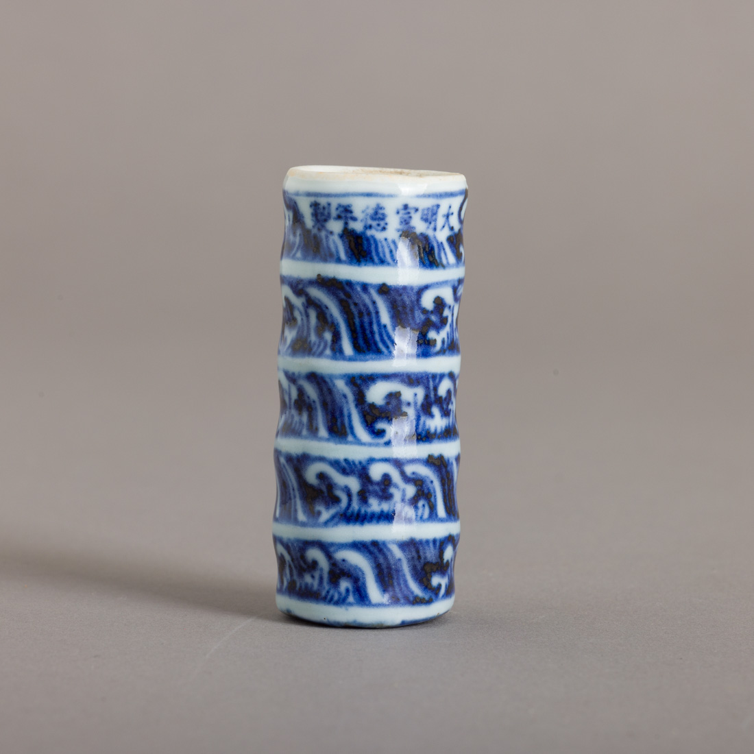 Em porcelana da China, decoração a azul e caracteres. Sinais de uso