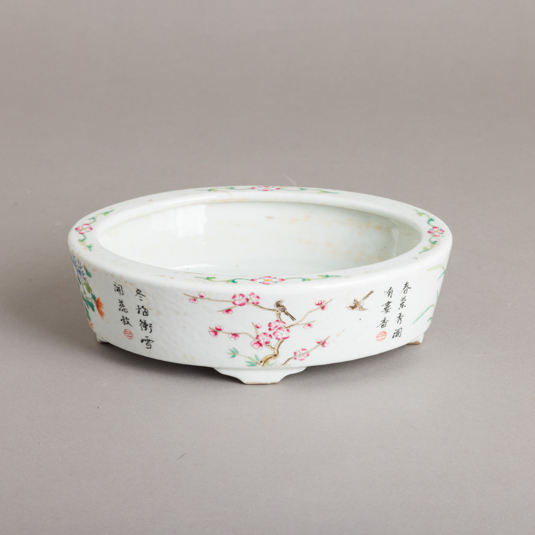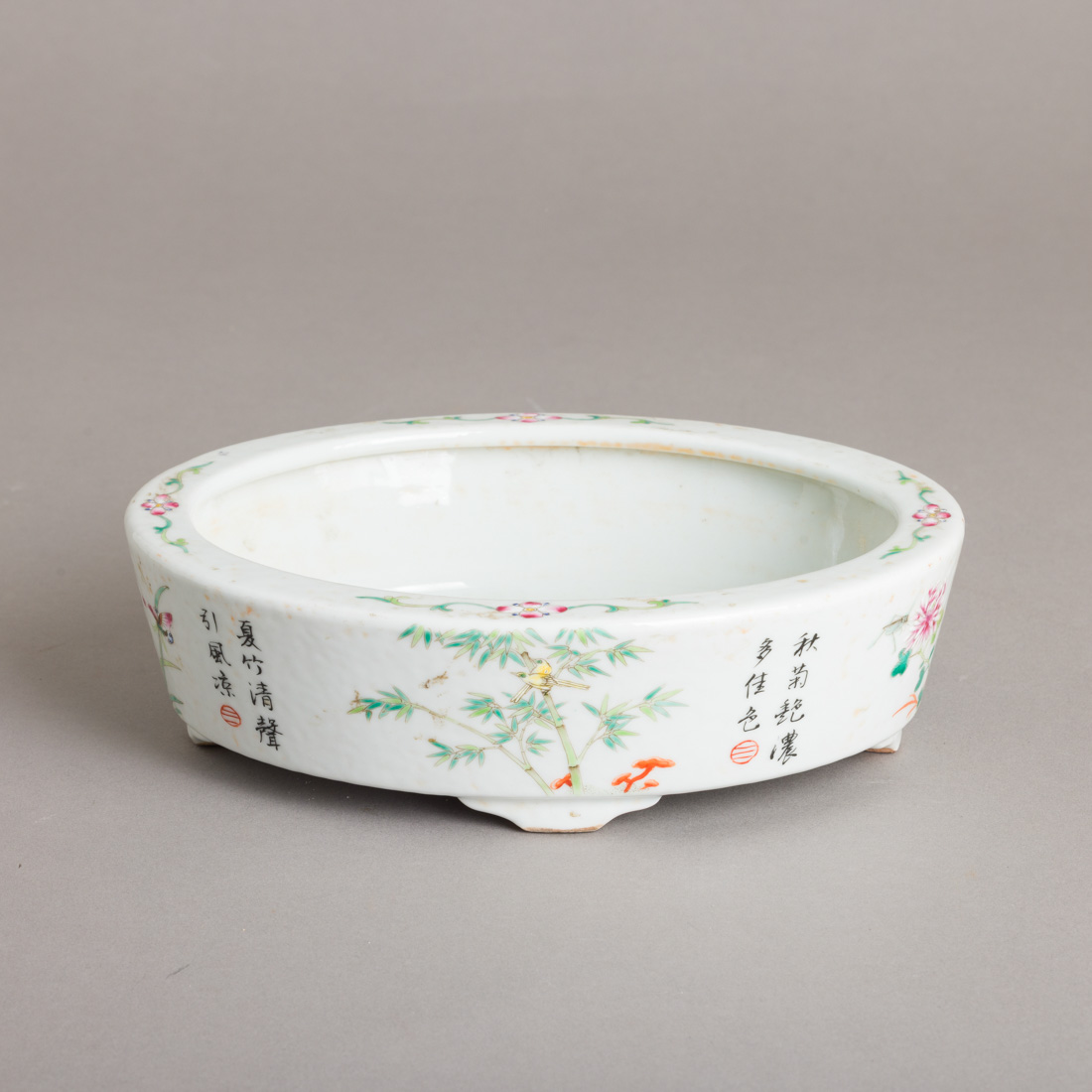 Em porcelana da China, decoração policromada com flores, pássaros, elementos vegetalistas e caracteres. Marcada. Sinais de uso.