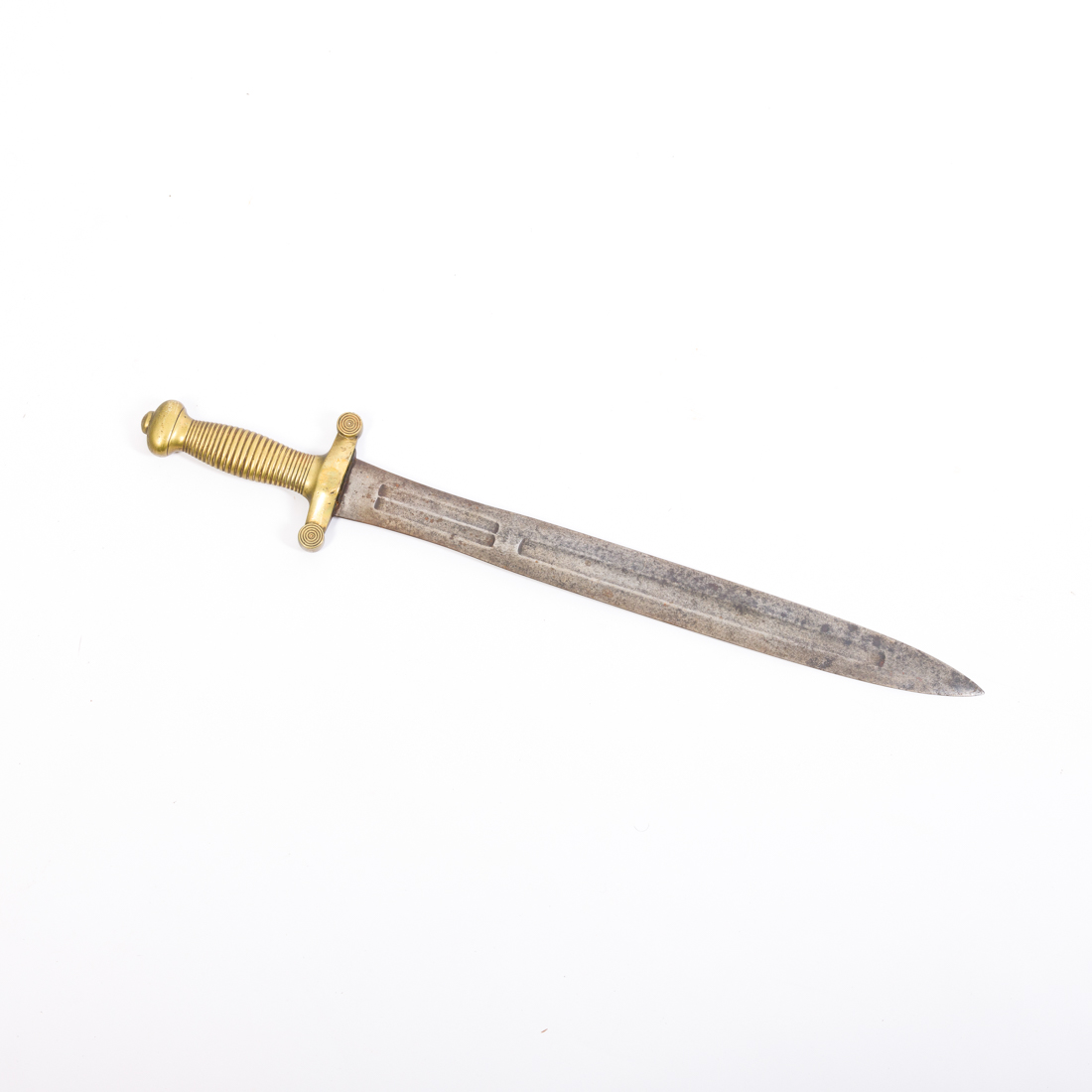 Da Época Império, França Napoleónica (1805/1817). Com o punho escamado e grossa lamina em ferro com goteiras ajaneladas conhecida internacionalmente por "coupe-choux". Usada frequentemente pelos invasores nos campos cultivados ainda hoje vão aparecendo nos campos de batalha. Sem marcas ou punções. Peça histórica. Dim.: 63 cm.