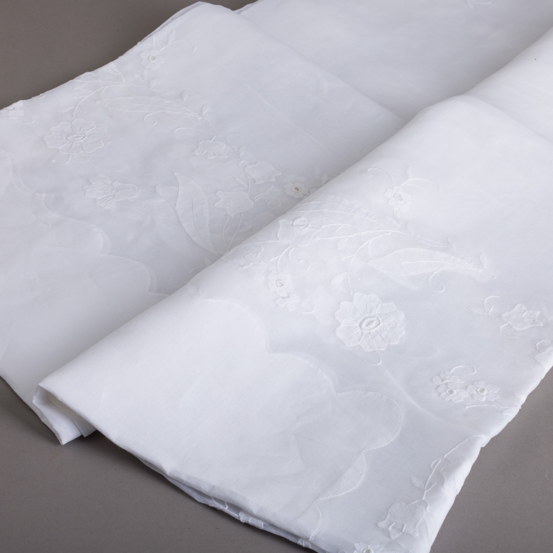 Em organza branca bordada com "flores". Pequenas manchas.