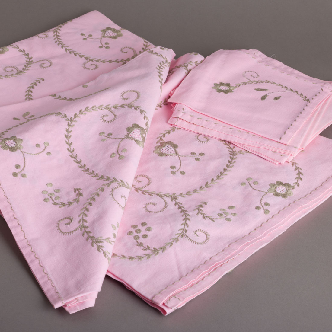 Em algodão de tom rosa bordado a cinza. Sinais de uso e manchas.