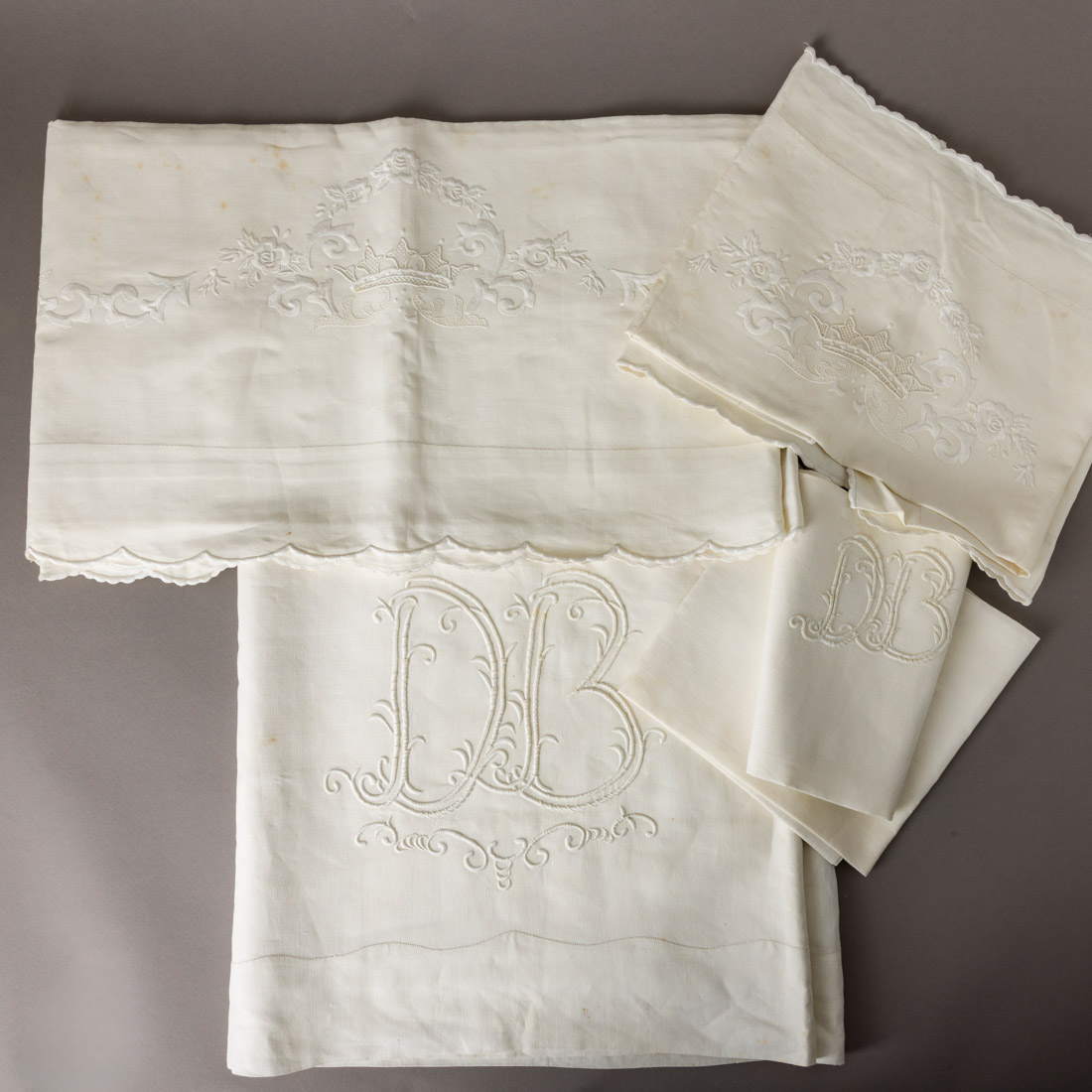 Em linho bordado á mão "Coroa", outro monogramado. Sinais de uso e pequenas manchas.