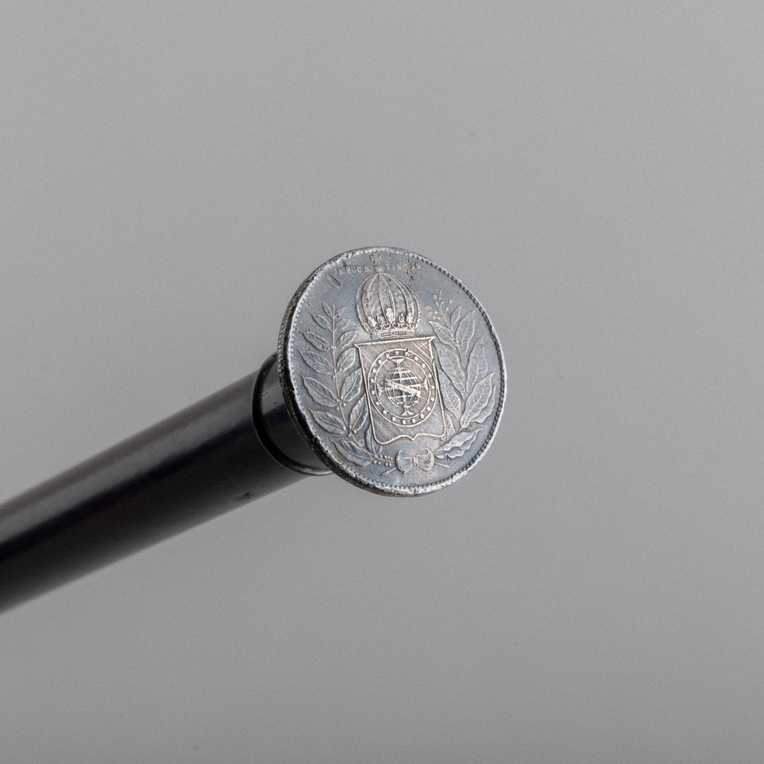 Em madeira exótica, castão em prata "moeda brasileira" de 1852. Sem marcas, ao abrigo do Decreto-Lei n.º 120/2017. Sinais de uso.