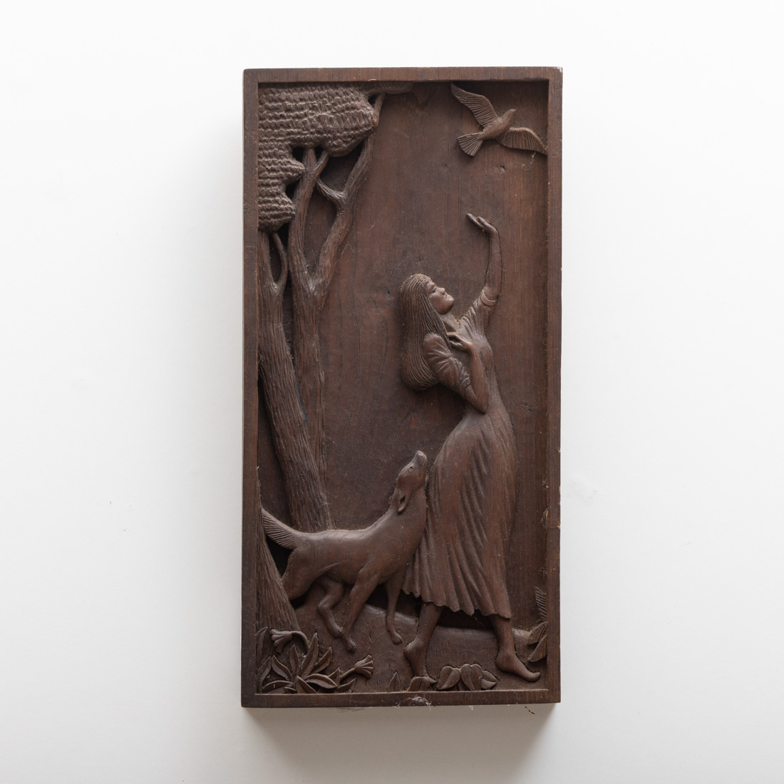 Em castanho entalhado e patinado "figura feminina com cão". Pequenas falhas e vestígios de xilófagos.