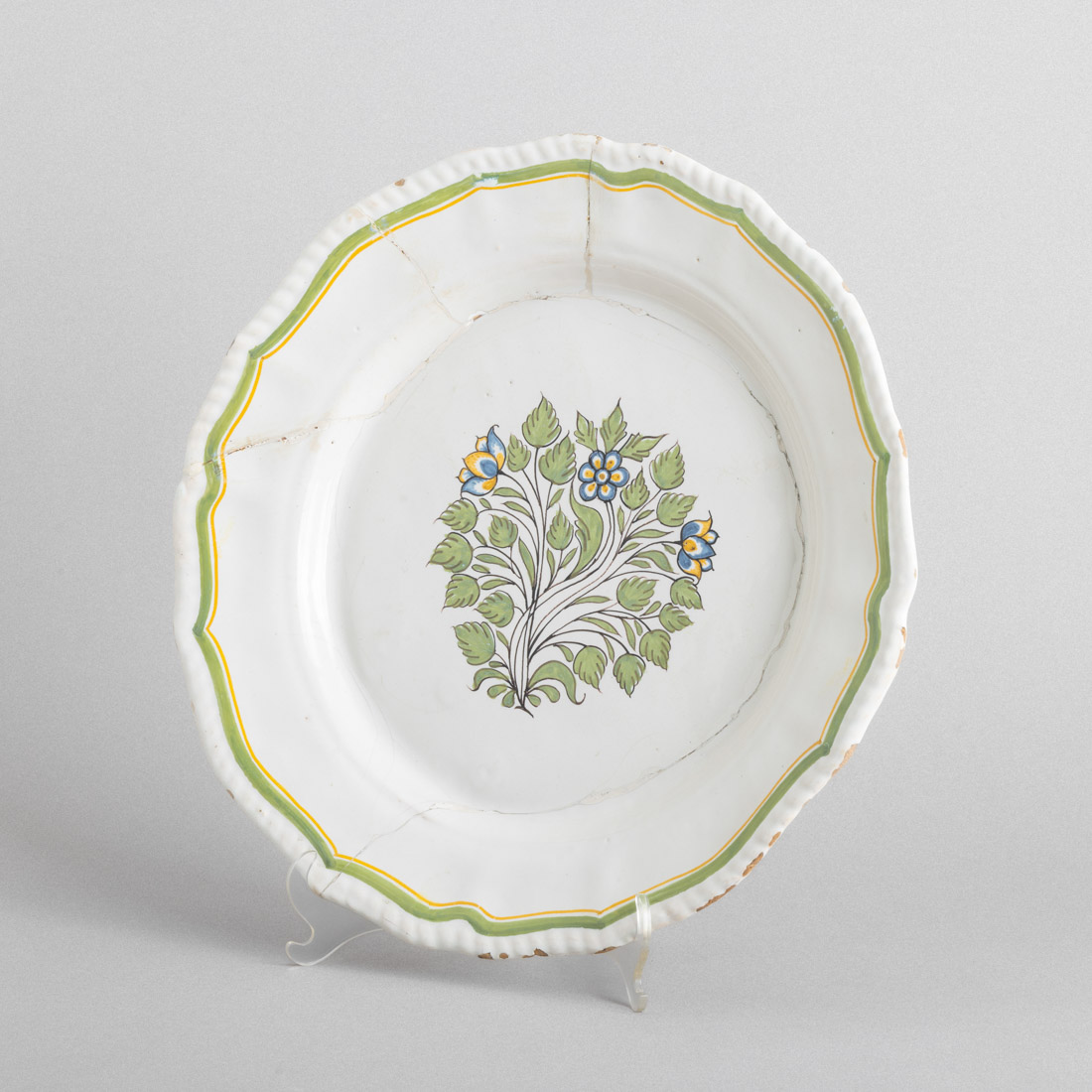 Em faiança portuguesa de Viana, Séc. XVIII/XIX, decoração policromada "flores", bordo encordoado. Marcado V. Esbeiçadelas, cabelos e restauros.