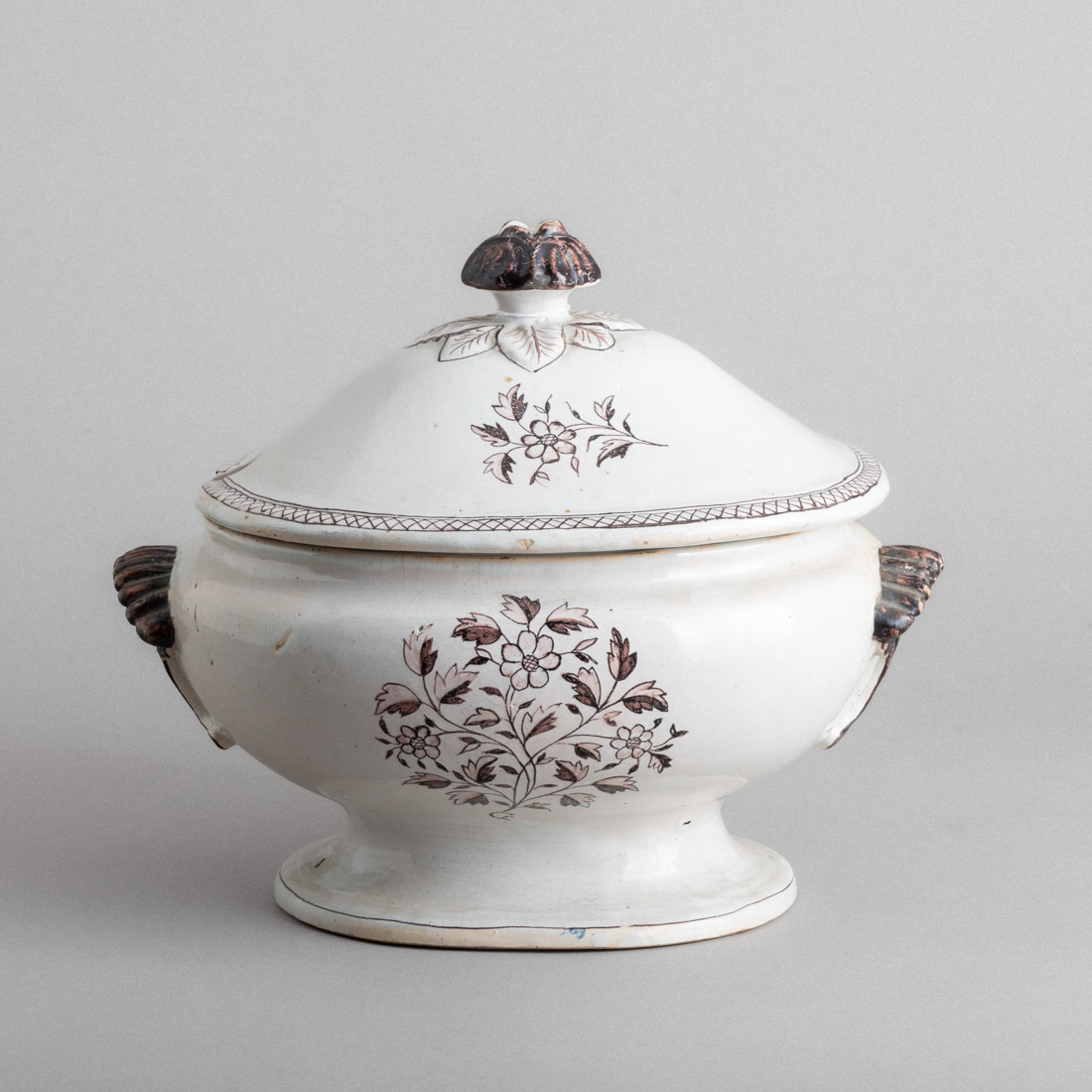 Em faiança portuguesa, decoração a vinoso "flores", pomo da tampa na forma de flor. Craquelé, pequenos cabelos e pomo com desgaste.