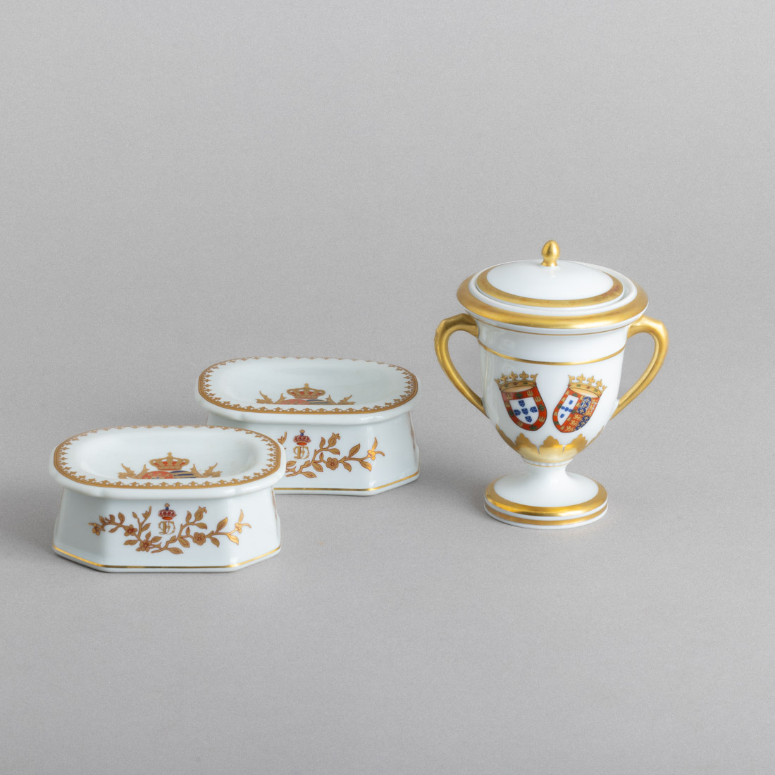 Em porcelana moldada (1980-1992), decoração policromada e dourada, "Brasão de armas de El-Rei D. Fernando II 1885-1985", mostardeira "Creative of Windsor 1386-1986". Edições limitadas. Sinais de uso.