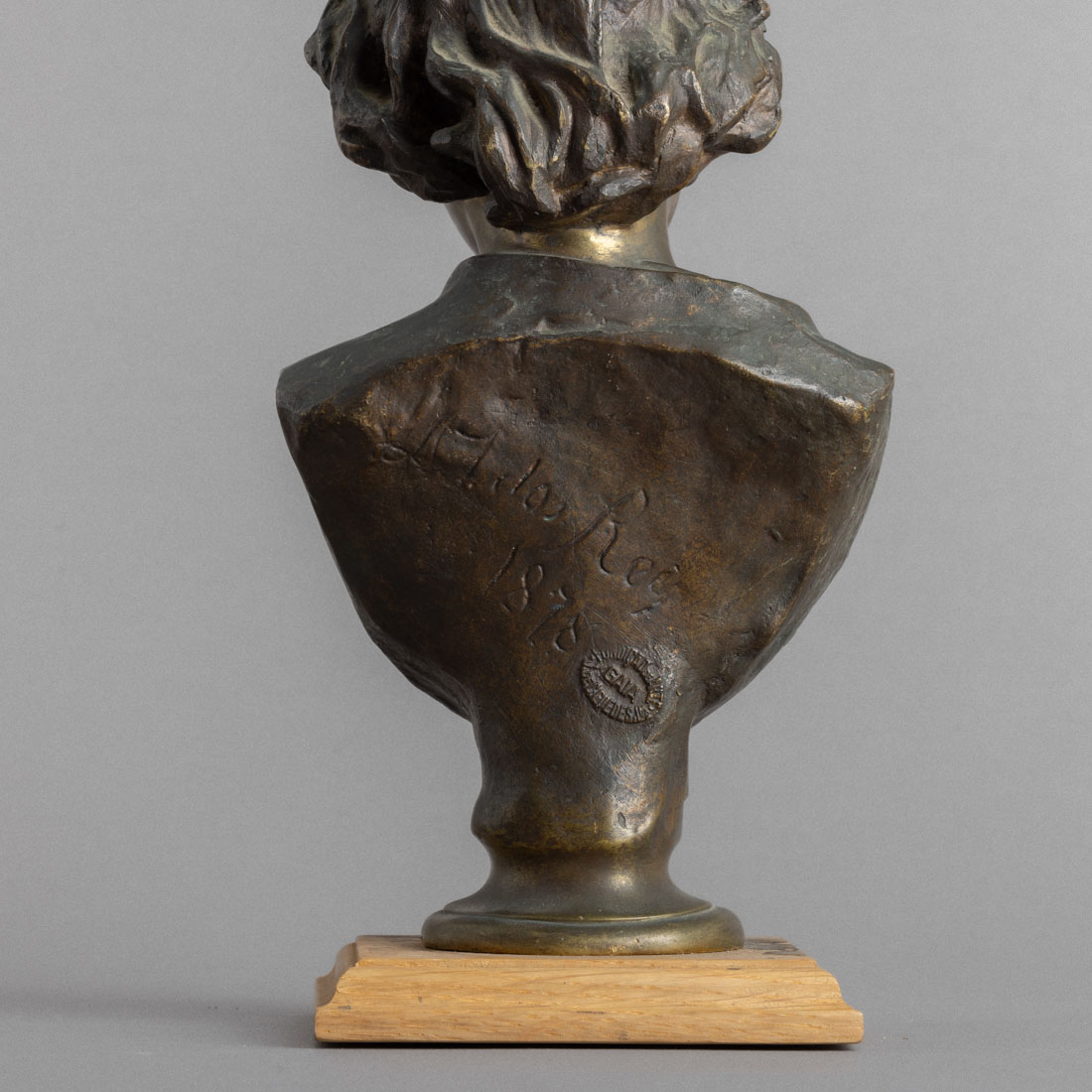 Busto em bronze patinado, assinado e datado de 1878, carimbo da Fundição de Arte J. de C. Guedes, Lda. - Gaia, base em madeira com manchas. Sinais de uso.