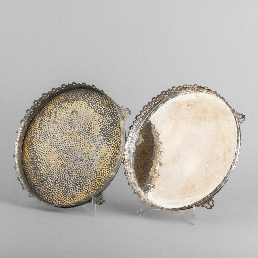 Em metal prateado, decoração martelada, gradinha vazada. Sinais de uso, pequenas amolgadelas e uma com desgaste.