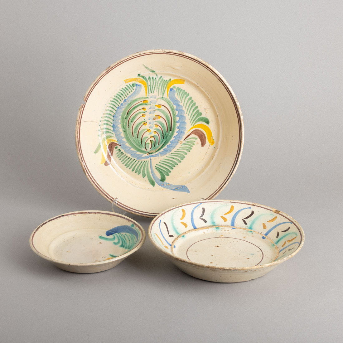 Em faiança portuguesa de Coimbra dita de "ratinho", decoração policromada "elementos vegetalistas". Desgaste no vidrado, esbeiçadelas e o maior com cabelo gateado.