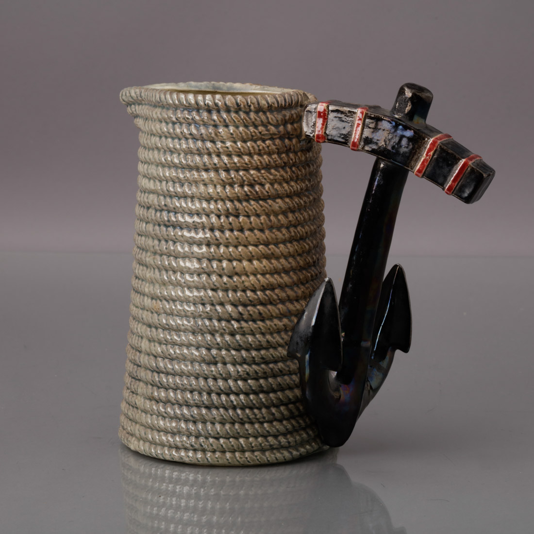 Em cerâmica vidrada das Caldas, marcado da Fábrica de Faianças de José A. Cunha Sucessores, decoração relevada e policromada, simulando corda. Âncora com colagens e pequenas faltas.