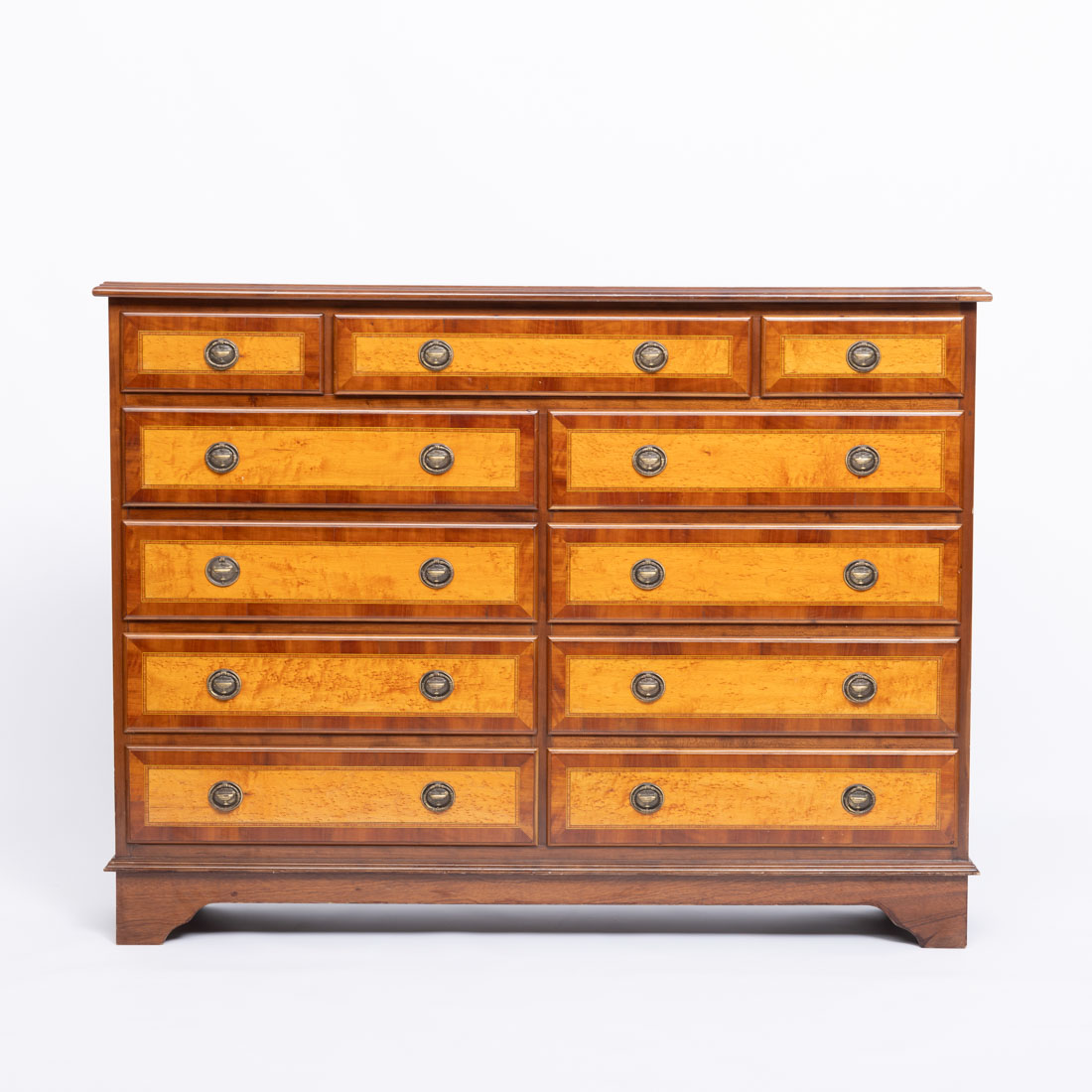Folheado a diferentes madeiras, de onze gavetas. Pequenos defeitos.