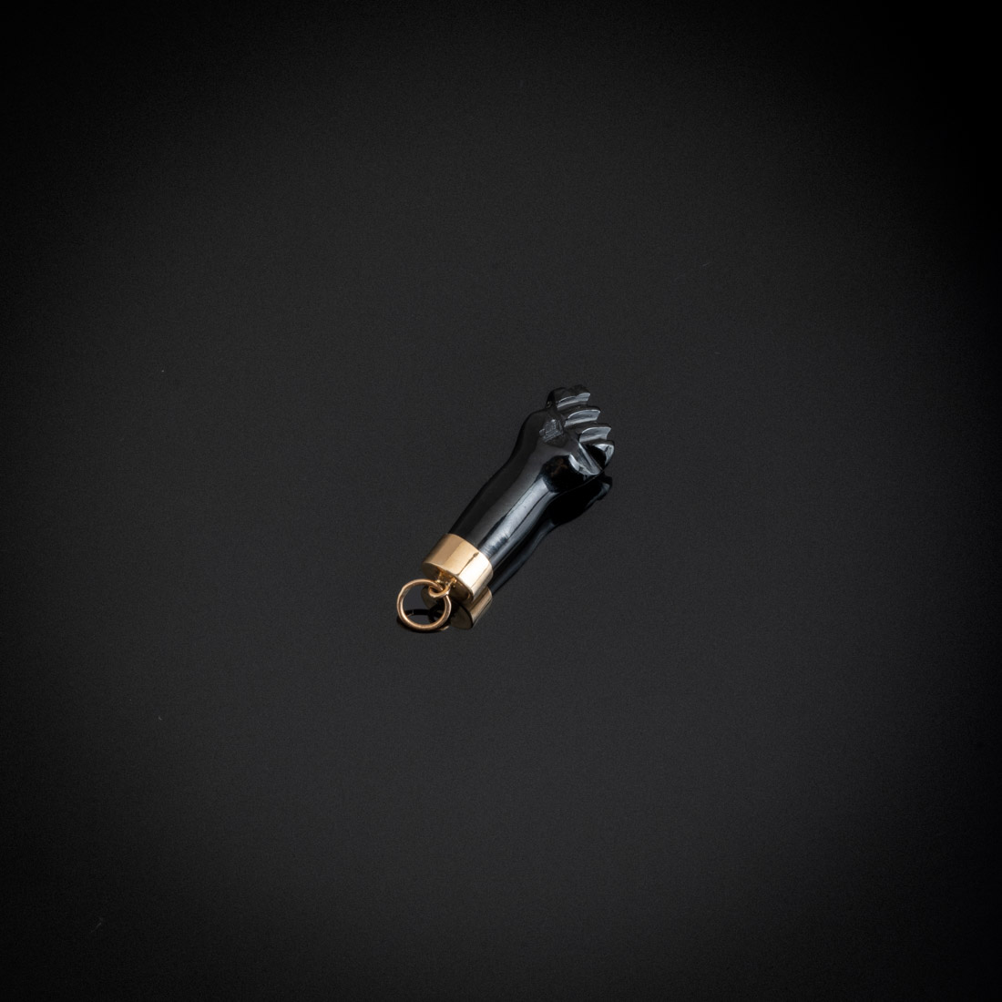 Em azeviche, aplicação em ouro português. Sem marcas, ao abrigo do Decreto-Lei n.º 120/2017. Sinais de uso.