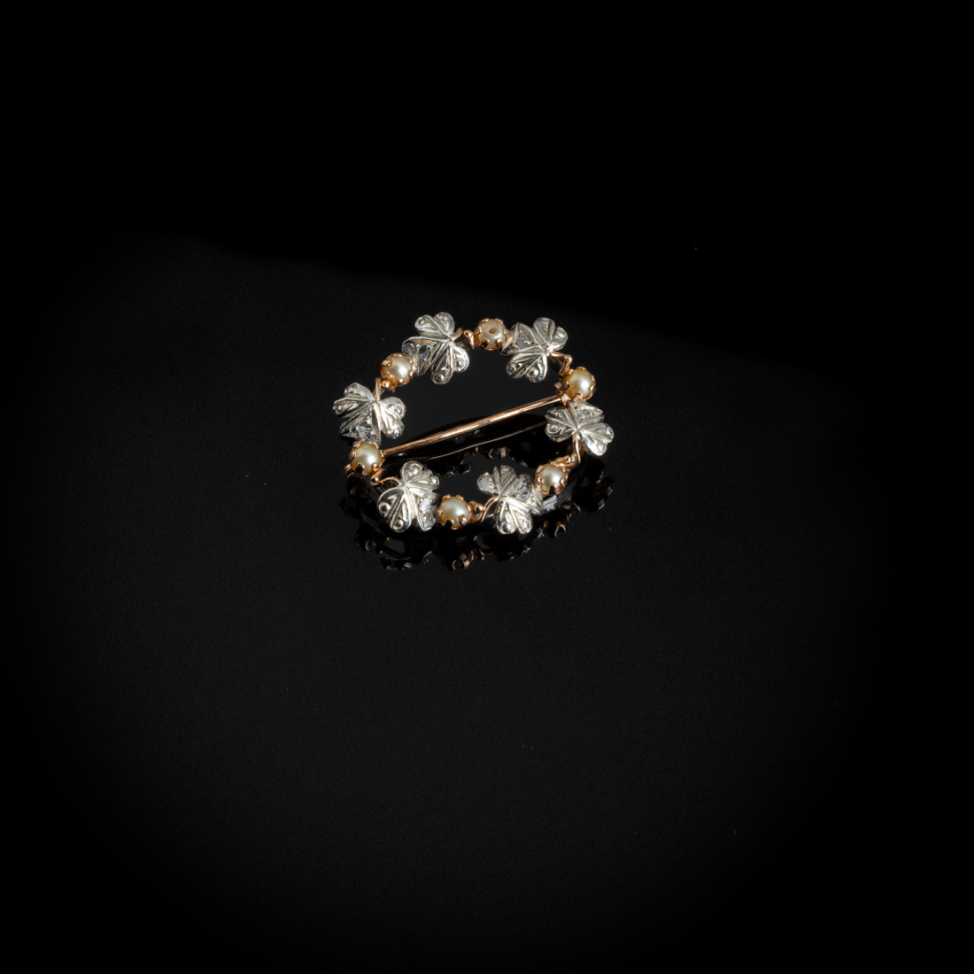 Em ouro português de 19,2Kt., e prata contraste cão e galo (1938-1984), cravejado com diamantes em talhe rosa e pérolas de cultura (não testadas). Sinais de uso.