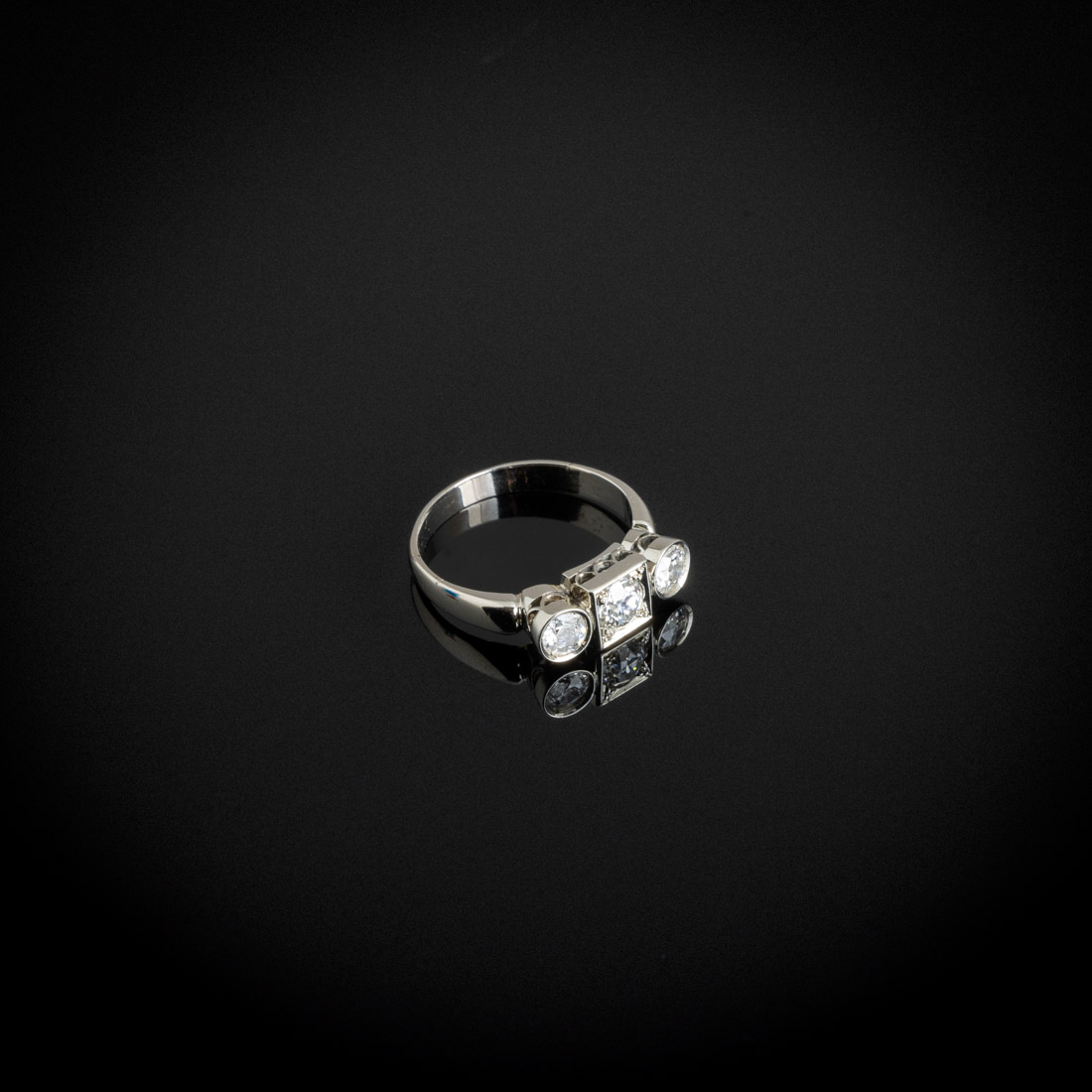 Em ouro branco português de 19,2Kt., contraste formiga e galo (1938-1984) cravejado com três diamantes e talhe antigo de brilhante. Sinais de uso.
