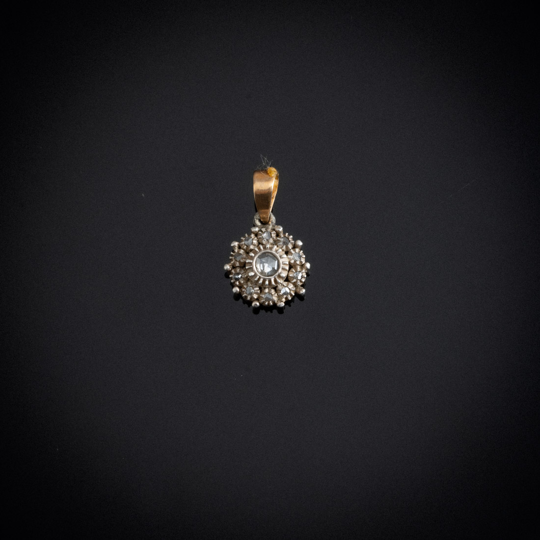 Em ouro e prata cravejada com diamantes em talhe de rosa. Sem marcas, ao abrigo do Decreto-Lei n.º 120/2017. Sinais de uso.