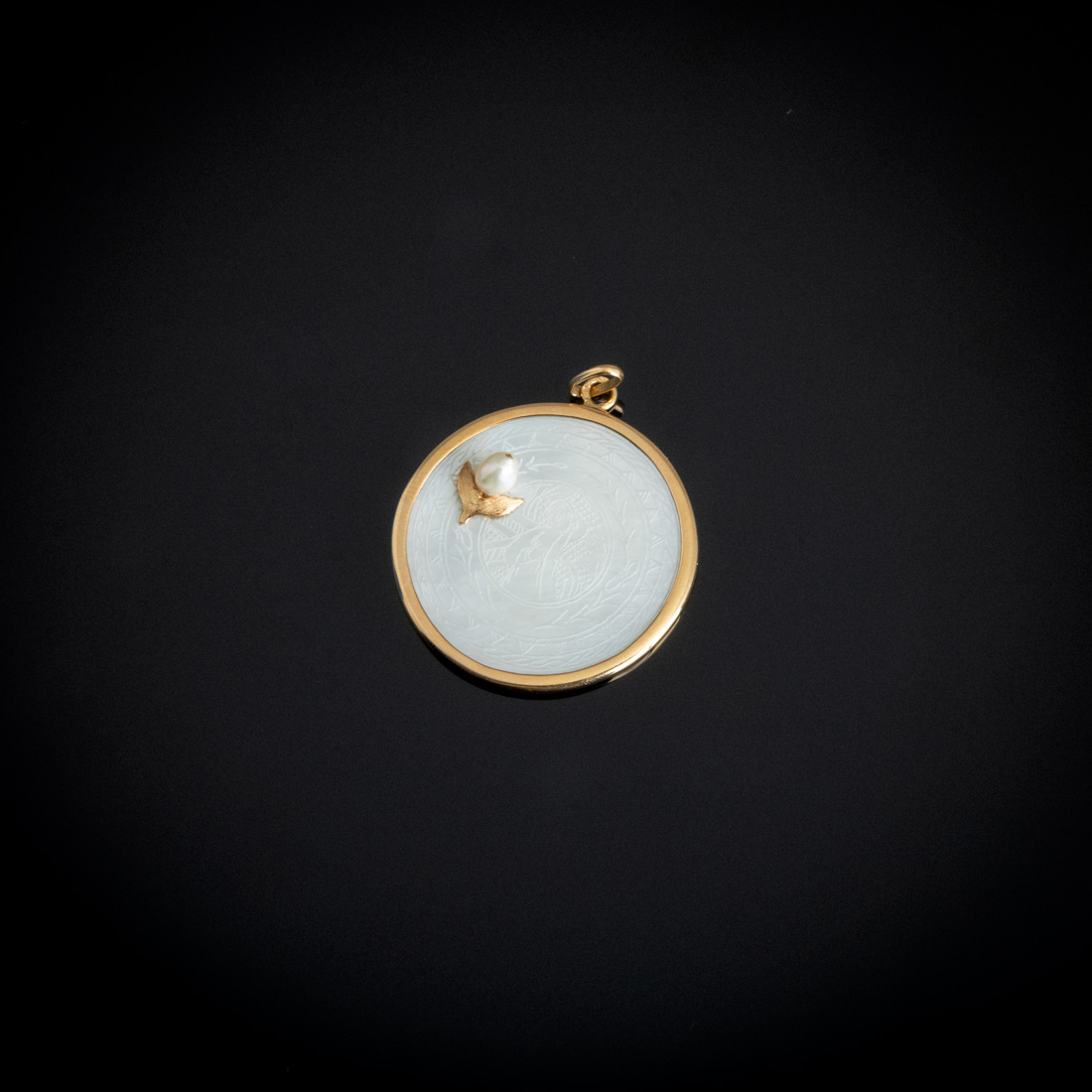 Aro e aplicação "flor" em ouro português de 19,2Kt., contraste veado (pós 1985) e placa em madrepérola gravada. Sinais de uso.
