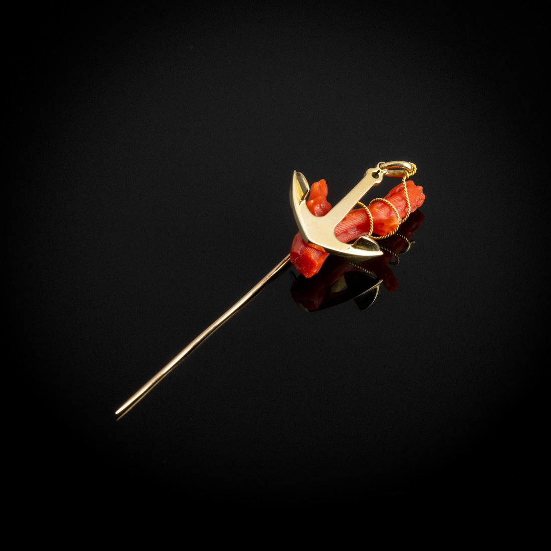 Em ouro de 18Kt., contraste andorinha (pós 1985) e coral do Mediterrânio. Sinais de uso.