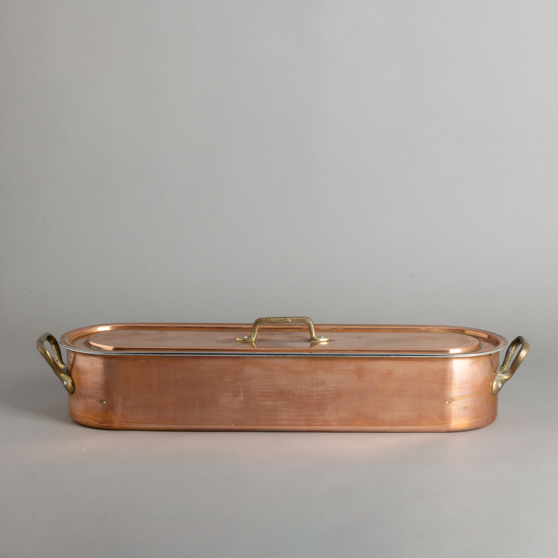 De grandes dimensões, em cobre, pega da tampa e asas em ferro. Com a grade interior. Sinais de uso.