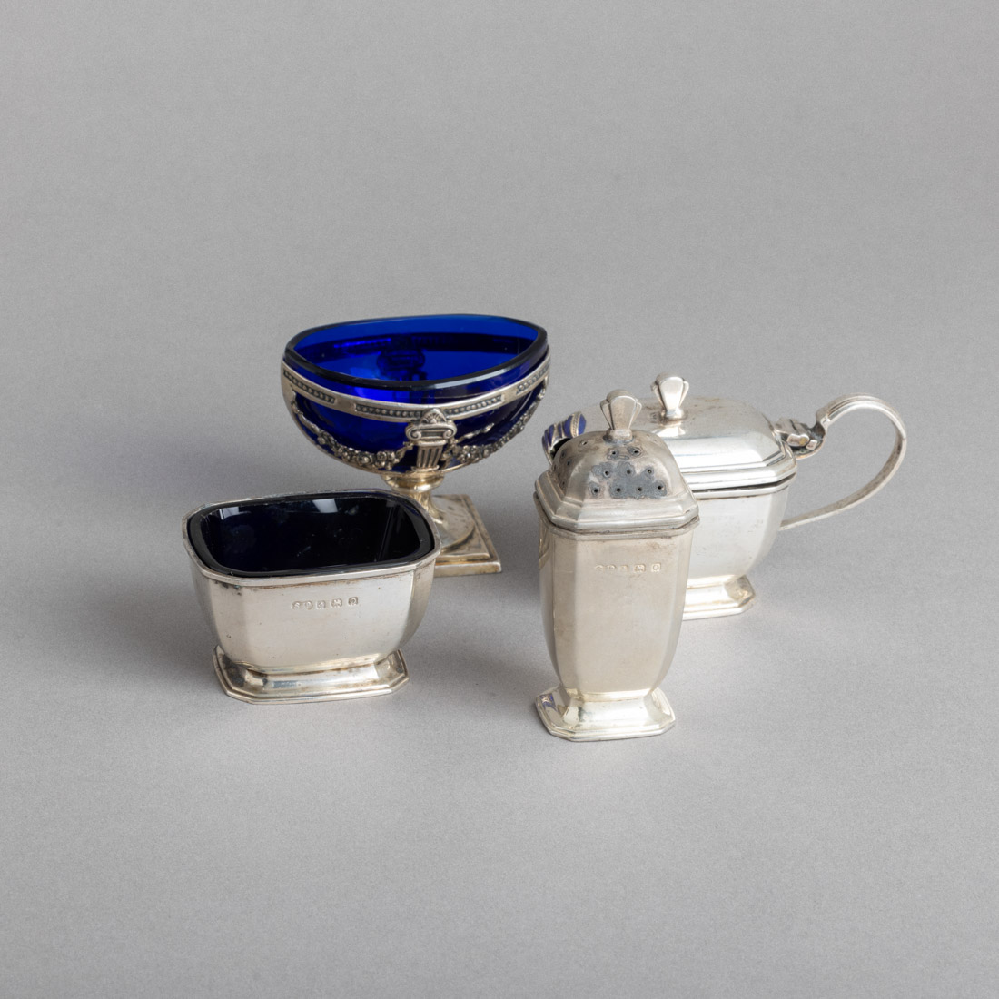 Em prata inglesa de 925, marcas de garantia da cidade de Birmingham, e prata alemã de 800, marcas de garantia de teor (pós 1886), decoração diversa, almas em vidro azul. Sem contraste português, ao abrigo do D/L. n.º 120/2017. Ligeiras amolgadelas, oxidações e um saleiro com falhas. Peso aprox.: 152 g. (só prata). Dim.: 3,5 a 8 cm.