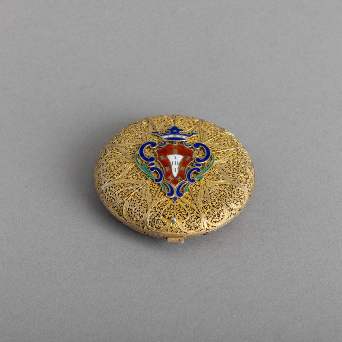 Em prata e filigrana de prata dourada contraste águia (1938-1984) de 833, aplicação de esmaltes policromados "Armas de Portugal". Sinais de uso.