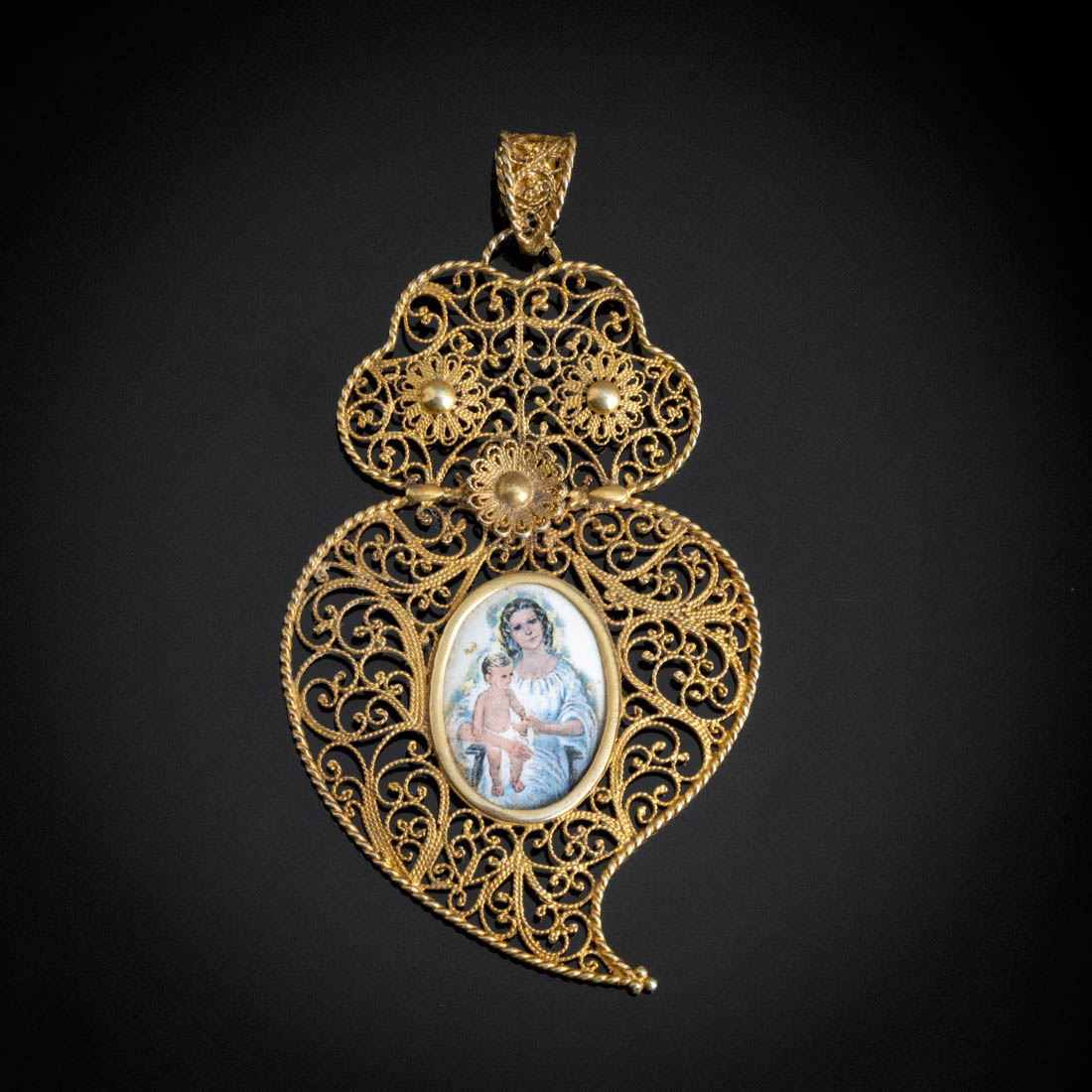 Em prata e filigrana de prata dourada portuguesa contraste águia (pós 1985) de 835, decoração relevada, aplicação de esmalte policromado "Nossa Senhora das Neves". Sinais de uso, pequenos defeitos no esmalte.