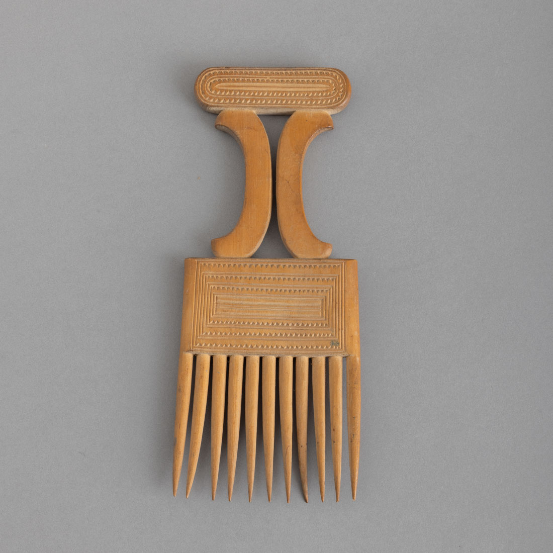 Em madeira exótica, decorada com desenhos geométricos. Sinais de uso e fissura.