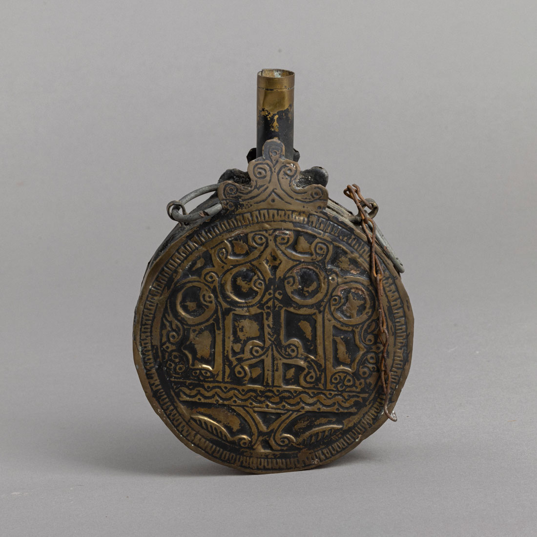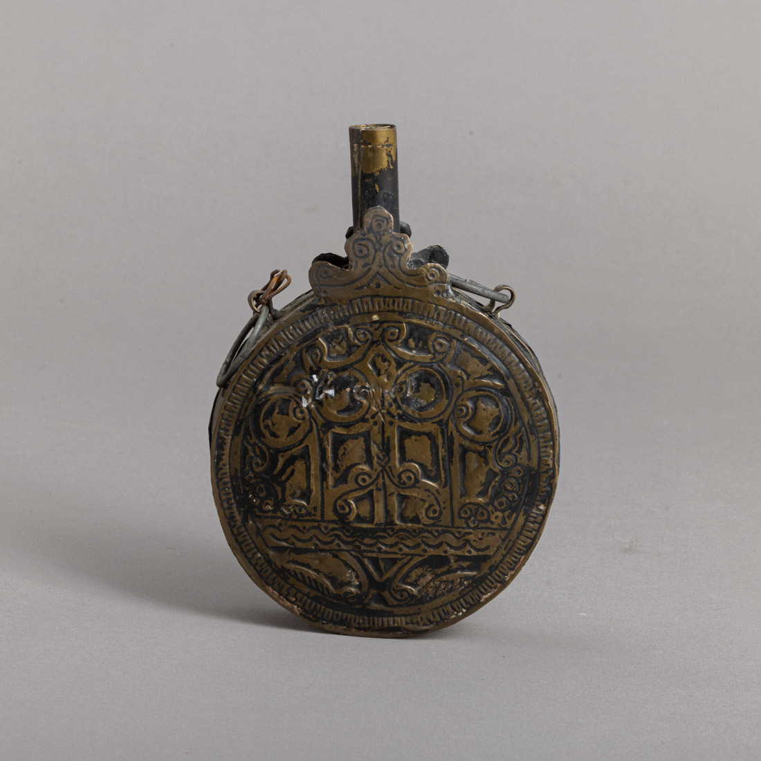 De forma circular dos meados do Séc. XIX. Todo em metal amarelo, coberto inteiramente com motivos árabes. Tem 2 grandes argolas de suspensão. Pequenos defeitos e a necessitar de limpeza. Muito decorativo.