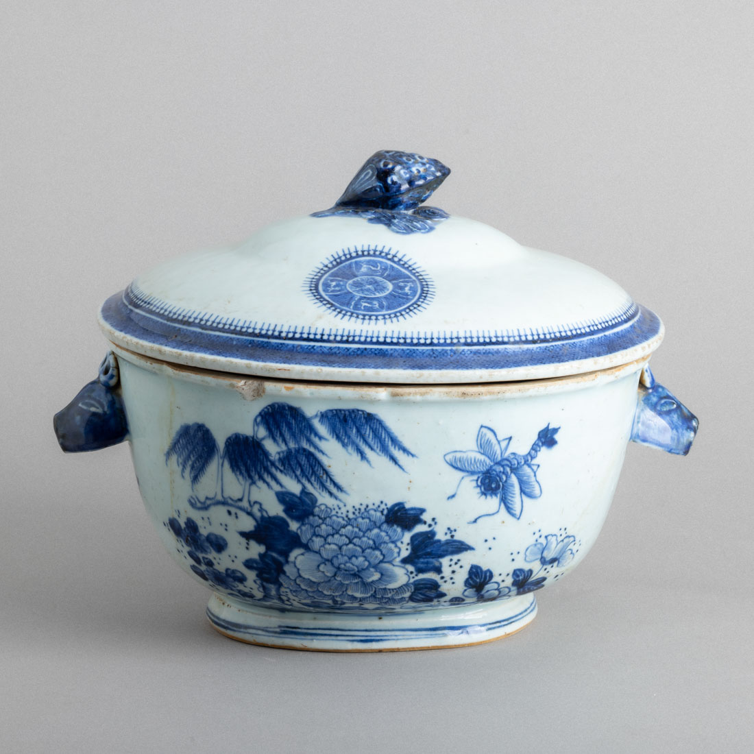 Em porcelana da China, Séc. XVIII, decoração a azul "flores e insectos", pegas relevadas "cabeça de javali". Tampa não pertence. Desgaste, esbeiçadelas e base colada.