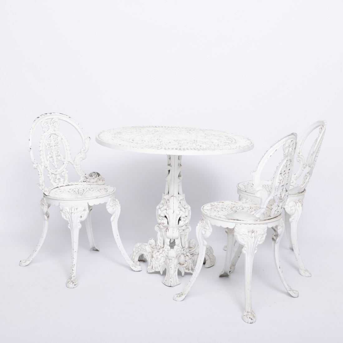 636. MESA REDONDA E TRÊS CADEIRAS DE JARDIM