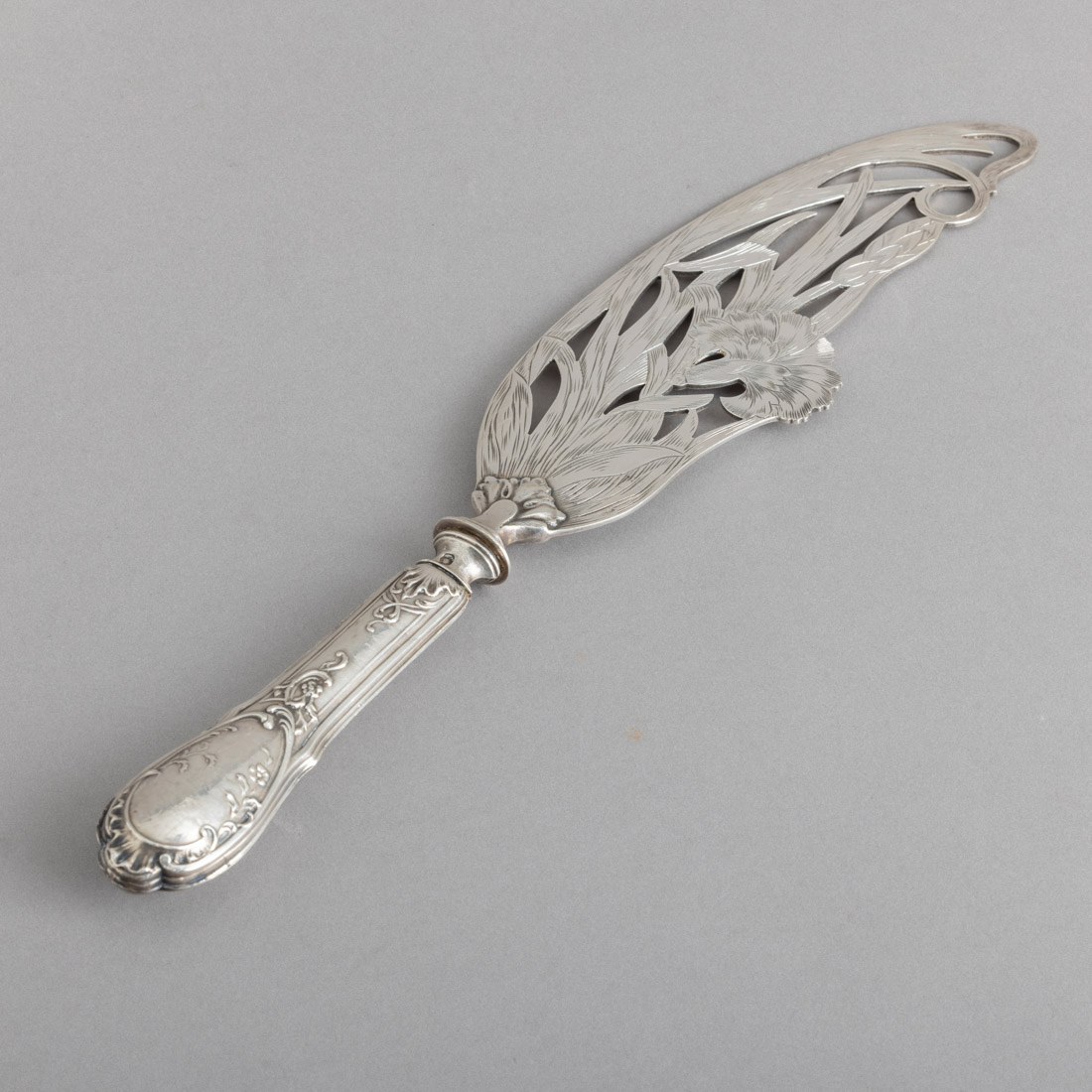 Cabo em prata francesa de 800, marcas de garantia de teor, decoração relevada, gravada e vazada "elementos vegetalistas". , sem contraste português, ao abrigo do Decreto-Lei n.º 120/2017. Pequenas amolgadelas e pequenos defeitos.