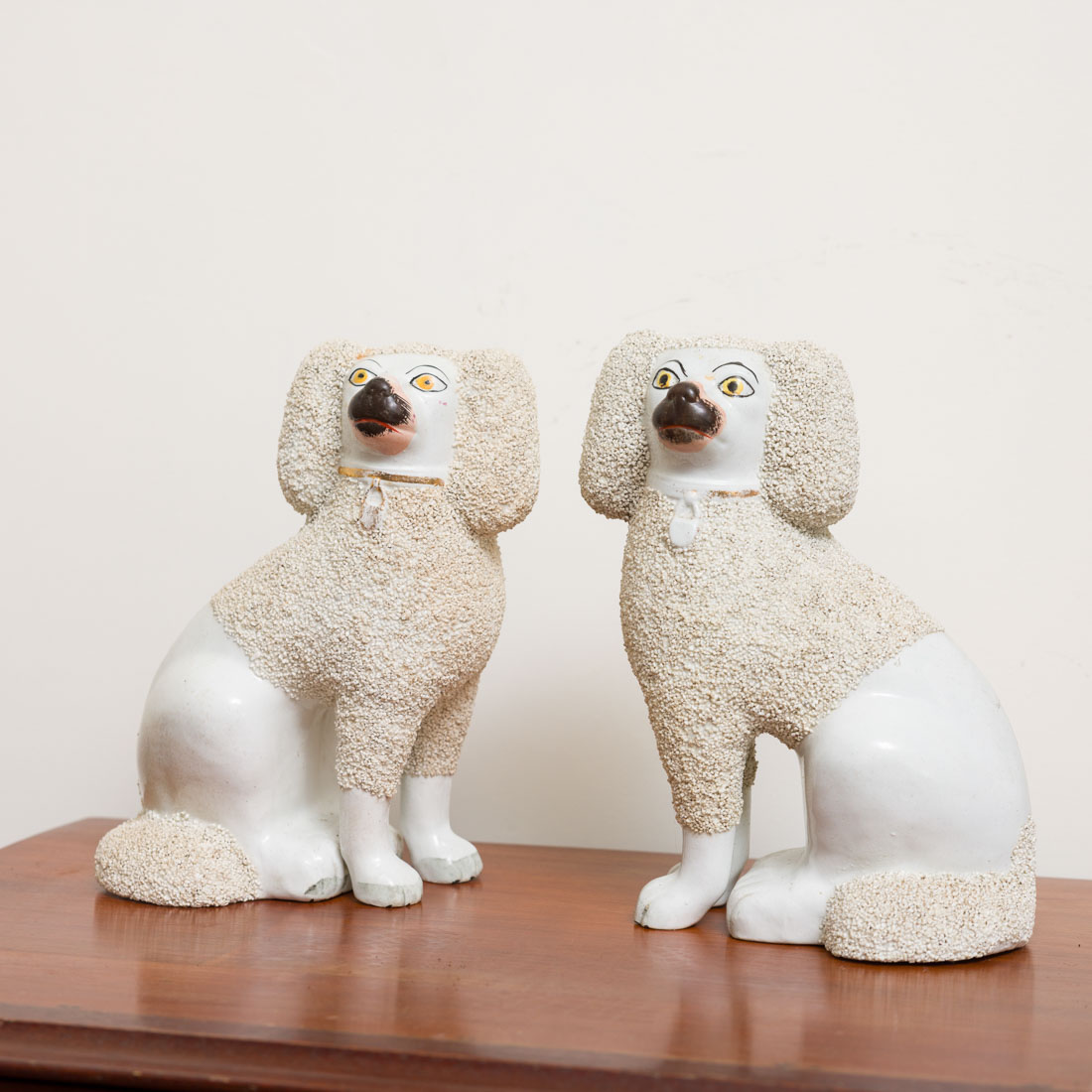 Esculturas em cerâmica de Staffordshire decoração relevada, policromada e dourada. Inglesas, Séc. XIX/XX. Sinais de uso e pequenas falhas no dourado.