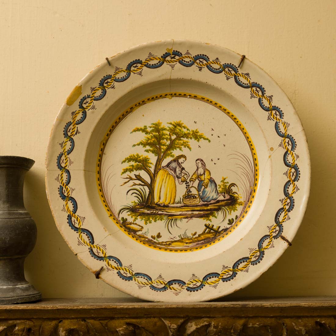 Em faiança portuguesa, decoração policromada "paisagem com figuras", Séc. XVIII. Colado, falhas, desgaste e pequeno restauro no bordo.
