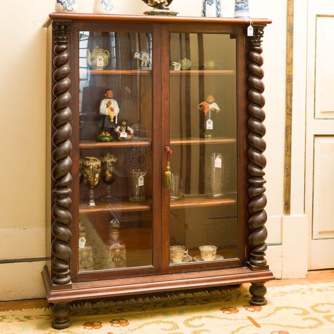 Em pau santo, ladeado por colunas torsas e capiteis entalhados, de duas portas com vidro. Séc. XIX. Pequenos defeitos e um vidro partido.