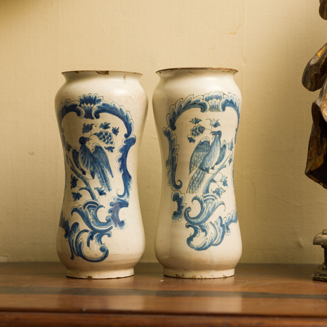 Em faiança portuguesa, decoração a azul "Cartela com pássaro". Séc. XVIII. Esbeiçadelas, uma com cabelos. E outra com defeito de fabrico.
