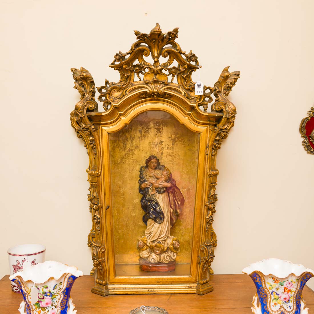 Em madeira entalhada e dourada, cimalha vazada, porta e laterais em vidro. Séc. XVIII/XIX. Redourado. No interior Nossa Senhora da Conceição, escultura em gesso policromada e dourada. Pequenas falhas e defeitos.