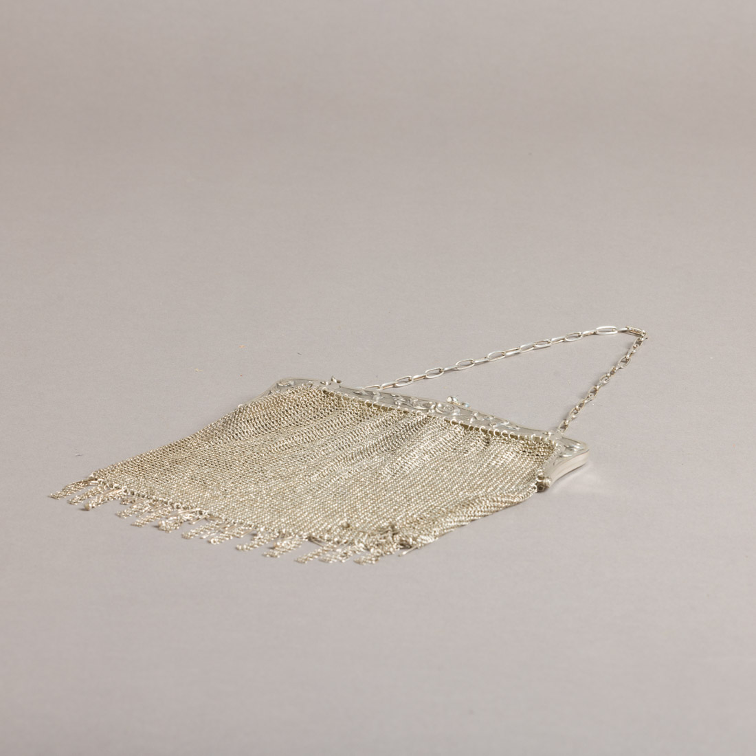 Em prata e malha de prata portuguesa contraste javali (1887-1937) de 833, decoração relevada "elementos vegetalistas e concheados". Sinais de uso e pequena amolgadela.