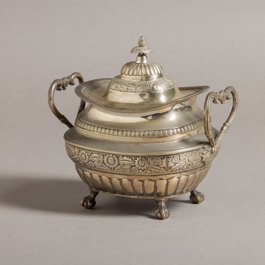 Em prata portuguesa do Séc. XIX marca do ensaiador do Porto (P-32), datável de 1836/43 e marca de ourives (P-429) datável de 1936/53, decoração gomada e relevada "flores". Sinais de uso e pequenas amolgadelas na tampa. Peso aprox.: 581 g. Dim.: 10x17 cm.Proveniência: col. Mário Barbosa.